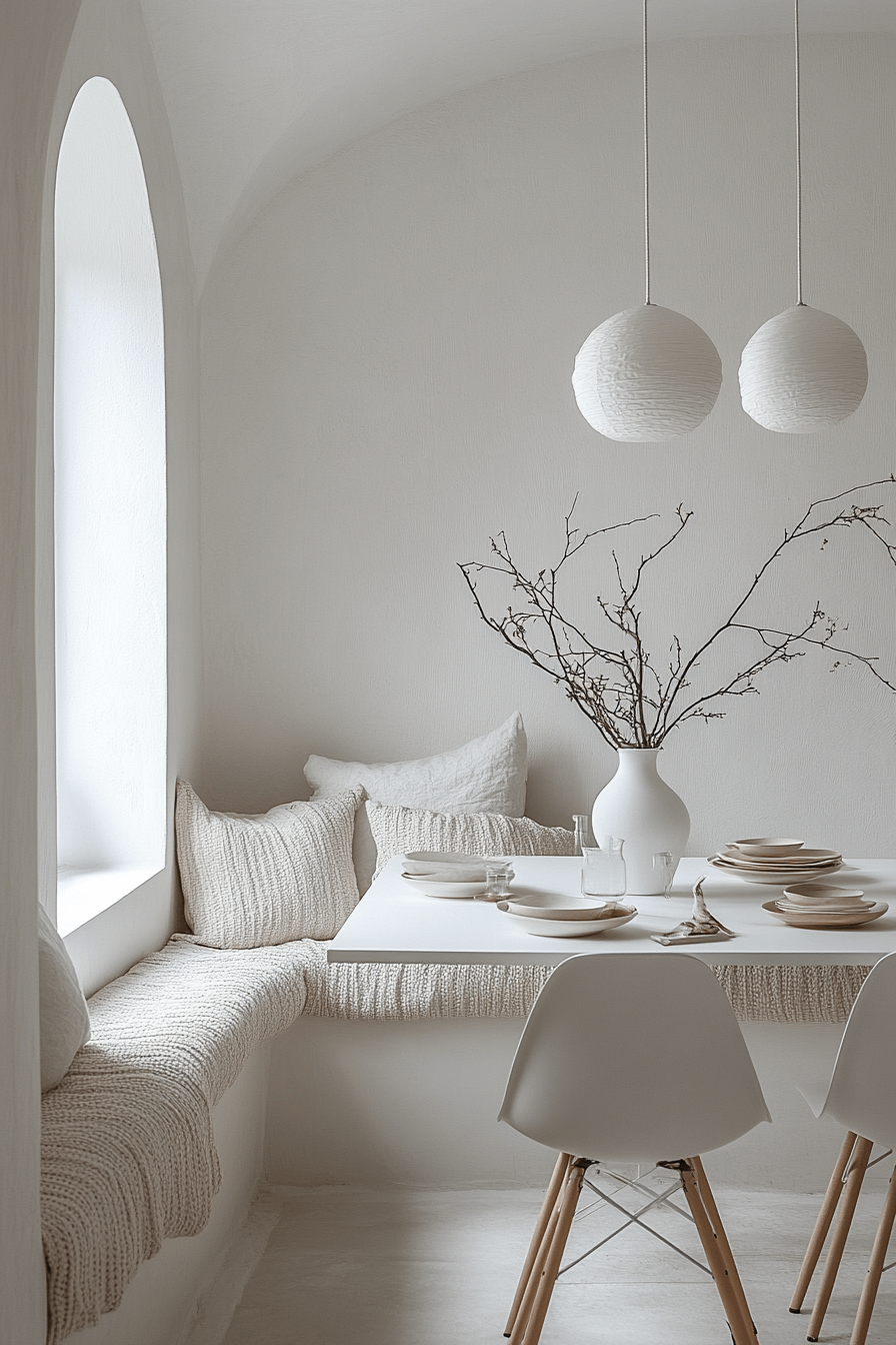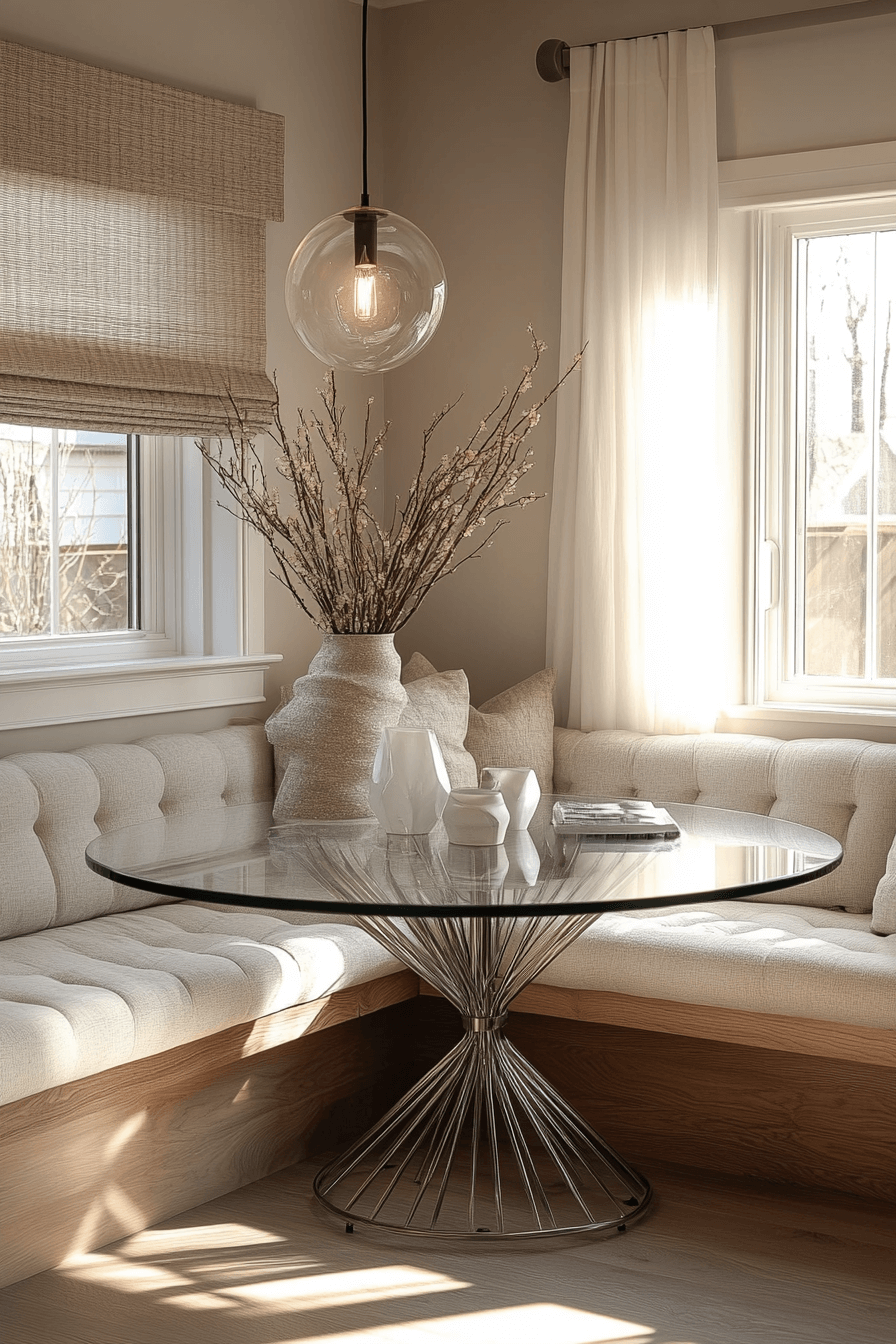 Simplicity can make minimalist breakfast nook ideas feel calm, polished, and surprisingly inviting. Built-in seating with hidden storage helps the nook stay organized while making the most of limited space. Soft whites, warm neutrals, and clean lines create an open look that never feels busy. A sculptural light fixture can add just enough character while keeping the design refined. The final space feels peaceful, practical, and effortlessly stylish. Discover more breakfast nook ideas that blend minimal beauty with everyday function!