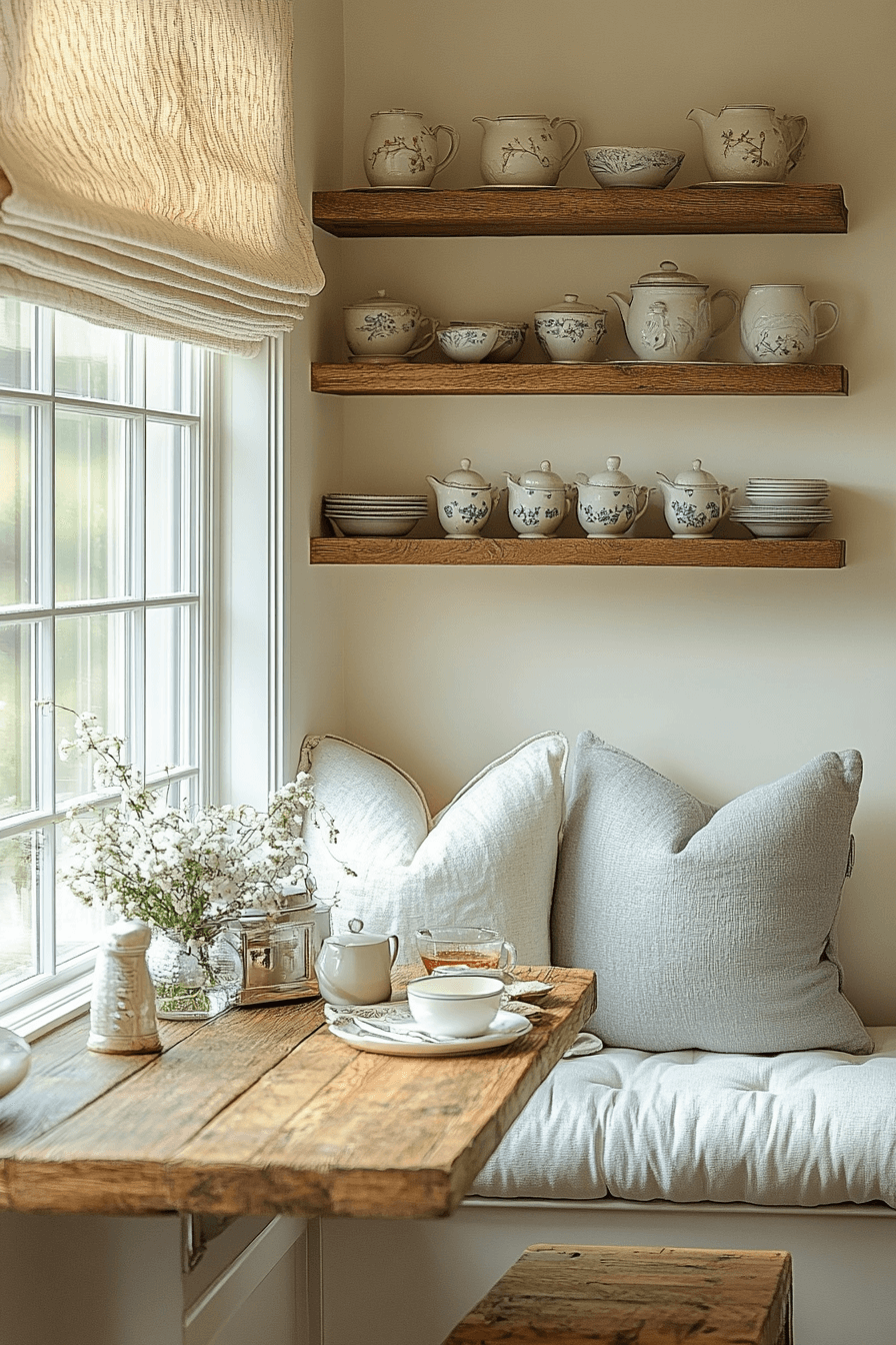 Tea-inspired styling can make gentle breakfast nook ideas feel graceful, comforting, and wonderfully calming. A petite table, soft seating, and shelves for teacups or favorite blends create a setting that invites you to slow down. Warm materials and a soft palette help the nook feel cozy and refined. This is the kind of space that makes a simple breakfast feel like a daily ritual. The final look is serene, elegant, and deeply inviting. Tap to discover more breakfast nook ideas perfect for peaceful tea-time mornings!