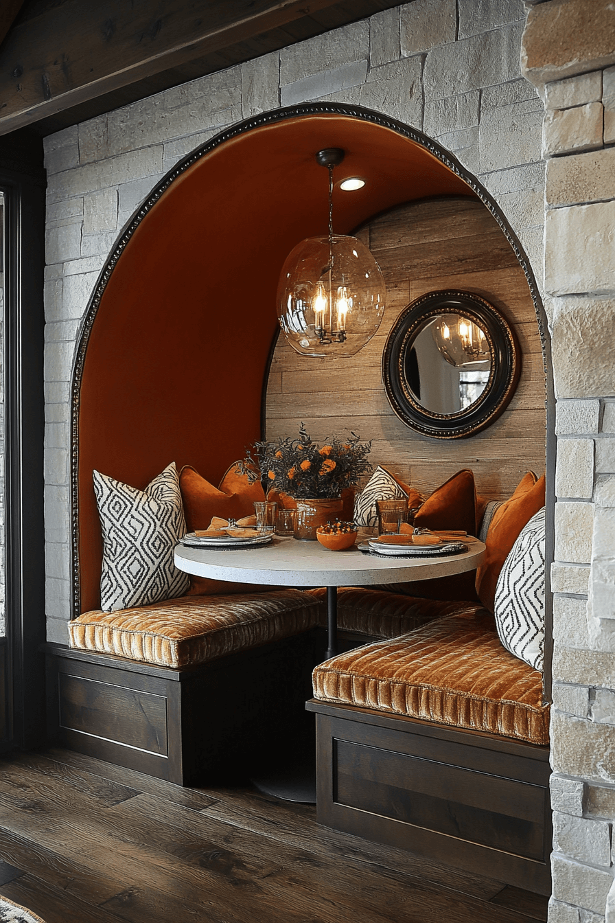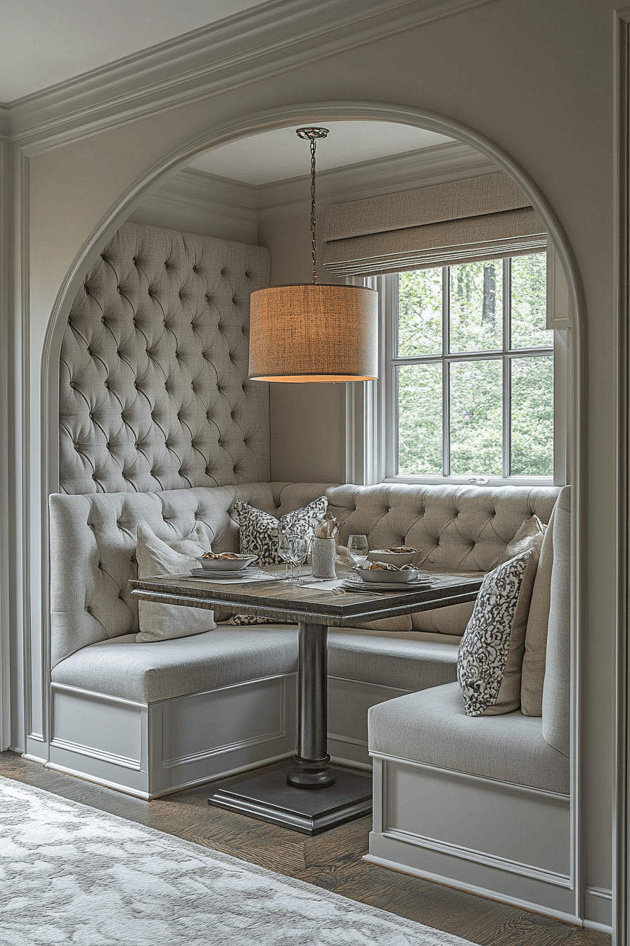 Plush details can make luxurious breakfast nook ideas feel especially cozy, elegant, and inviting. A velvet banquette adds softness and richness, while a refined table gives the whole nook a more elevated dining feel. Drapery, layered textiles, and small decorative touches deepen the cozy atmosphere. The space becomes perfect for long breakfasts and slow weekend mornings. The final look feels glamorous, warm, and beautifully special. Discover more breakfast nook ideas that blend luxury with everyday comfort!