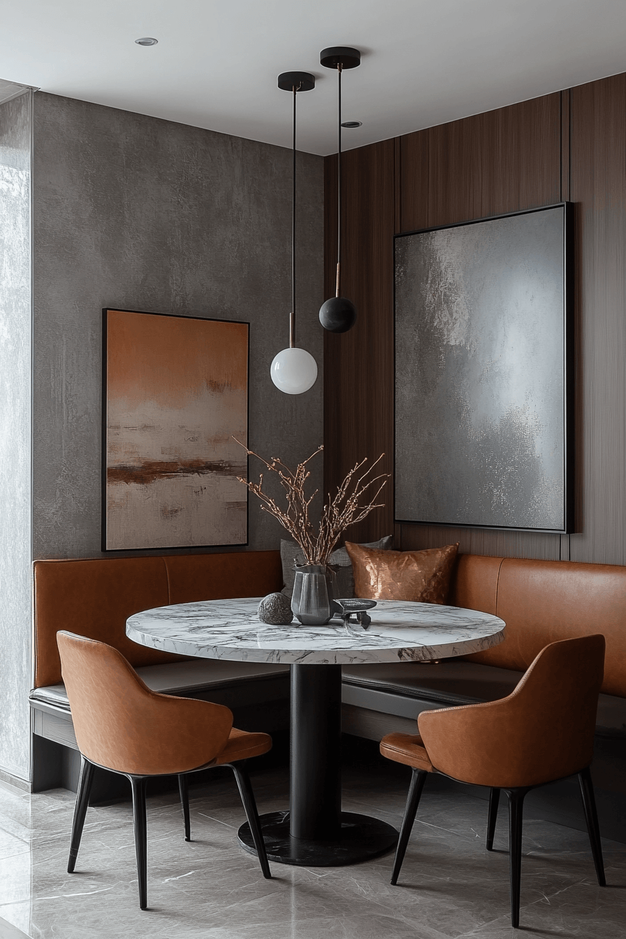 Modern finishes can make sleek breakfast nook ideas feel bold, clean, and beautifully polished. A glossy table paired with leather or structured seating creates a contemporary look that still works well for daily use. High-contrast colors and abstract art add energy while keeping the room cohesive. The design feels confident without becoming too formal. The final space is stylish, sharp, and full of modern appeal. Click to uncover more breakfast nook ideas with sleek contemporary flair!