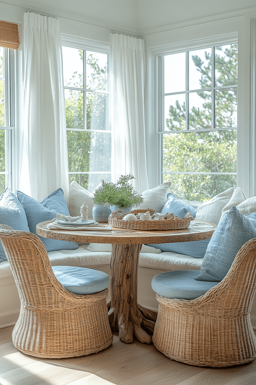 Breezy hues and natural textures can make coastal breakfast nook ideas feel like a little retreat by the sea. Soft blues, sandy neutrals, and airy fabrics help create a fresh and relaxed mood that works beautifully in the morning light. Rattan or woven seating adds texture while a crisp table keeps the area looking light and clean. Sheer curtains can make the whole nook feel even softer and more open. The result is calm, refreshing, and full of coastal charm. Dive into more breakfast nook ideas with easy breezy coastal style!