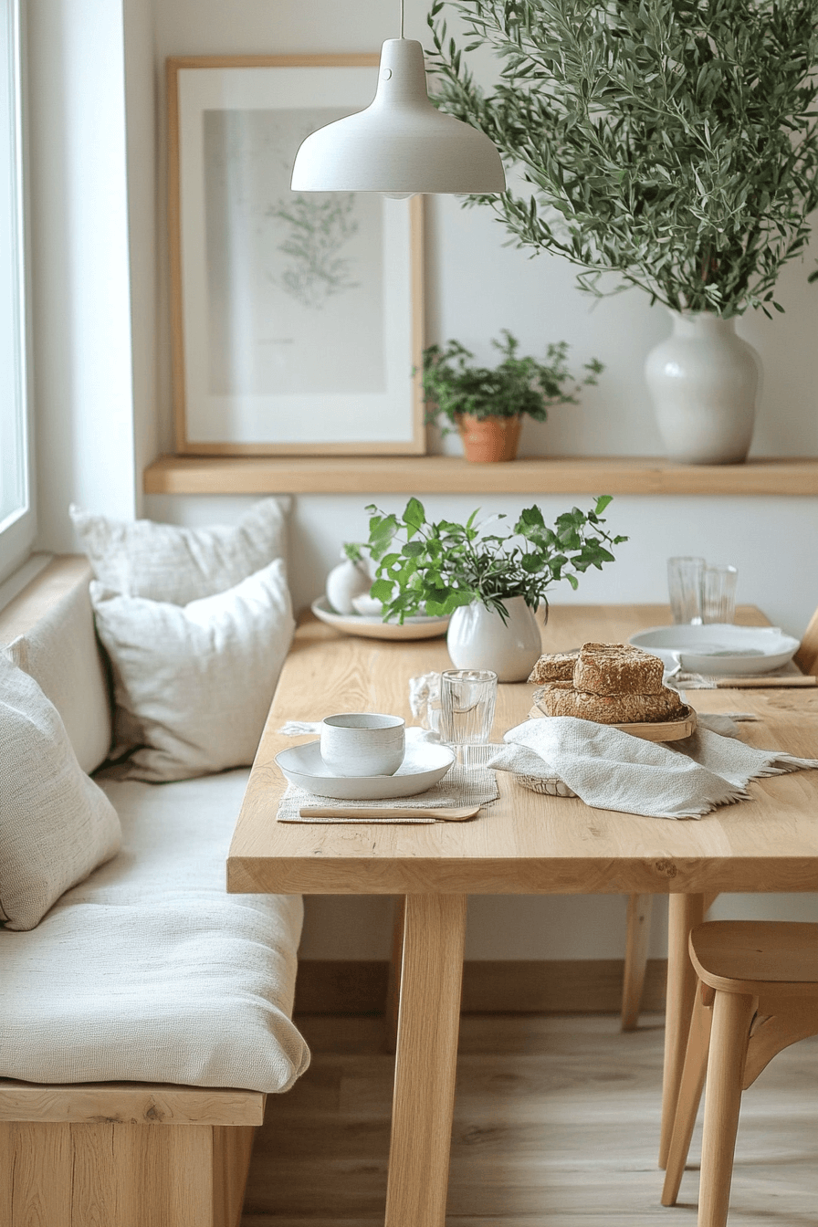 Scandinavian simplicity can make serene breakfast nook ideas feel both beautiful and deeply functional. Pale wood finishes, white surfaces, and gentle gray accents create a balanced palette that supports a calm start to the day. Comfortable seating and soft layered textiles add warmth without cluttering the design. A small touch of greenery can bring the whole nook to life in a natural way. The final look feels airy, welcoming, and effortlessly refined. Click to explore more breakfast nook ideas inspired by Scandinavian calm!