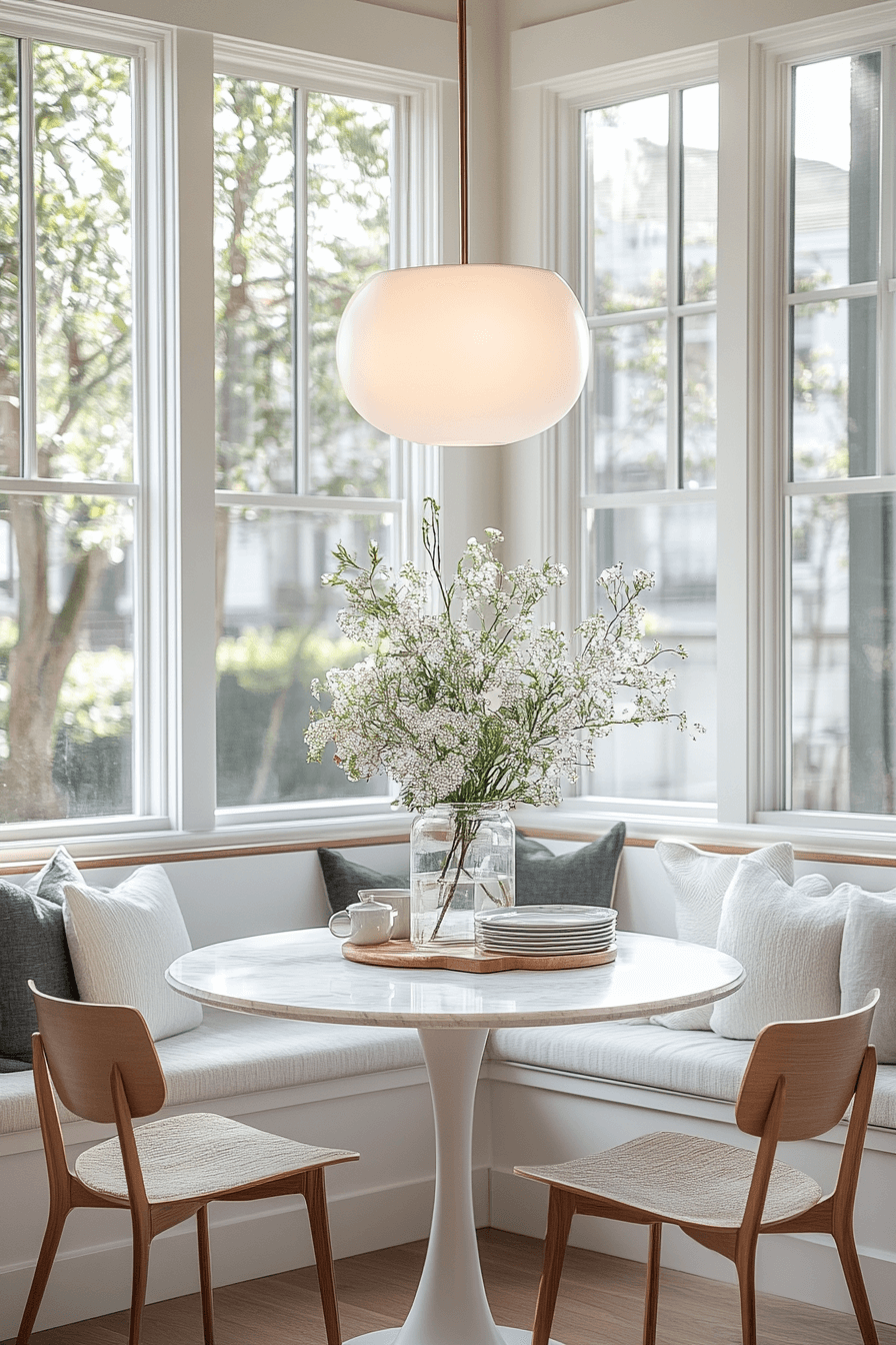 Pale finishes and open light can make airy breakfast nook ideas feel especially uplifting and serene. White furniture, soft pastel details, and a graceful pendant light all help create a bright, welcoming atmosphere. The room feels easy and breezy, making it perfect for slow breakfasts or relaxed conversations. Light-reflecting surfaces help the nook feel even larger and fresher. The final effect is elegant, cheerful, and beautifully open. Click to see more breakfast nook ideas with bright and breezy charm!