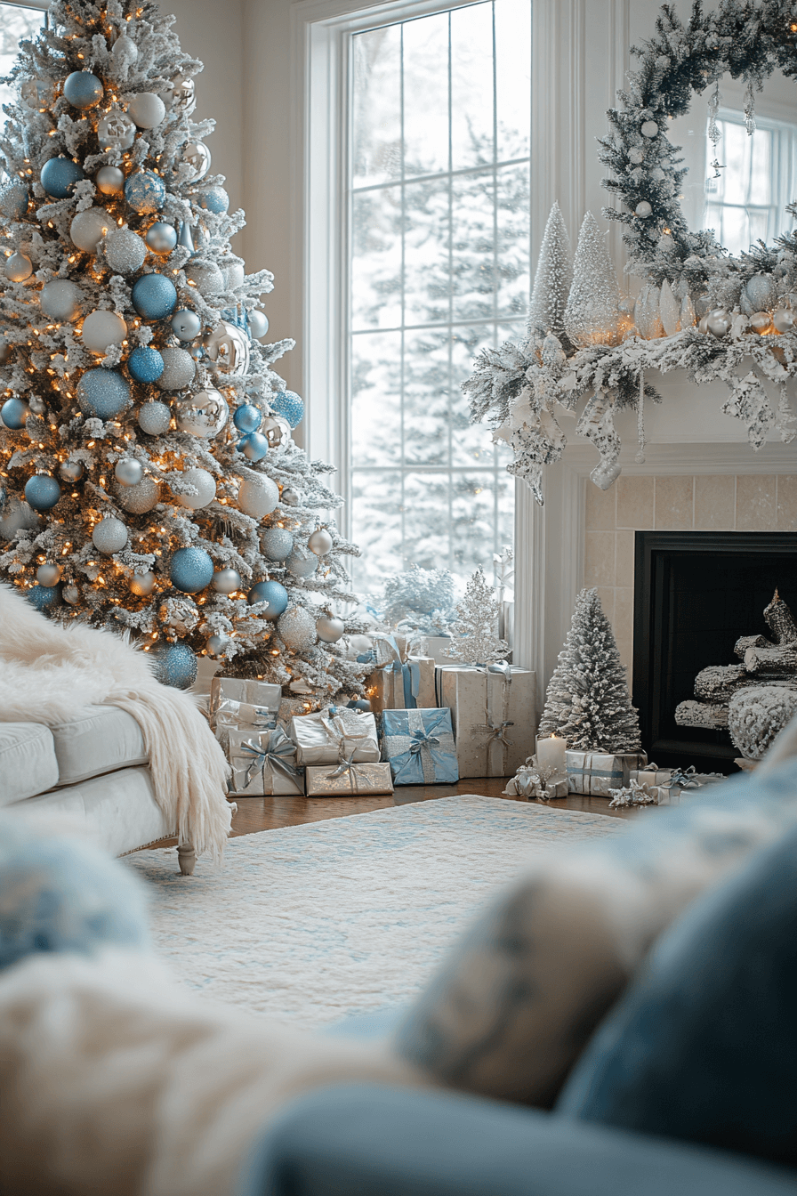 Winter brightness fills your living room through gentle blues, snowy whites, silver shimmer all built on your christmas aesthetic. Lantern glows soften the entire space with peaceful warmth. Plush textures support calm seasonal comfort. Twinkle details boost festive sparkle without overwhelming balance. This inspiring winter mood energizes strong momentum for bold decorating upgrades.