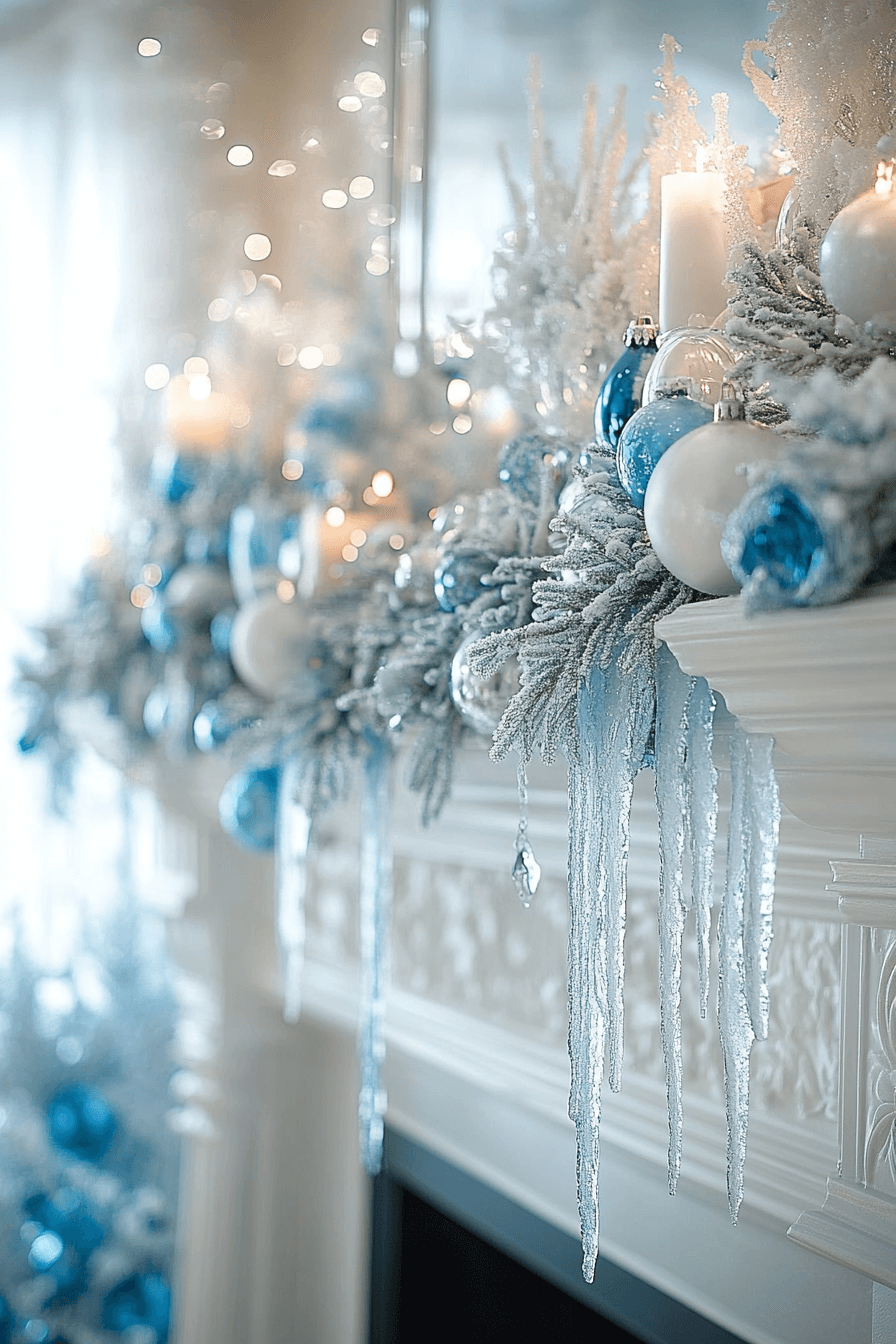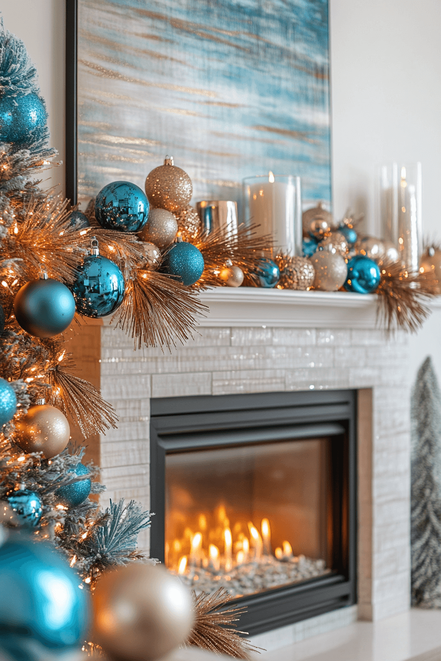 Create winter dreaminess indoors with christmas fireplace decor filled with frosty blues and crystal-inspired accents. Cool tones evoke tranquil seasonal escape. Snowflake shapes and icy ribbons complete the ethereal, peaceful look. Gentle lights soften the entire palette with quiet glow.