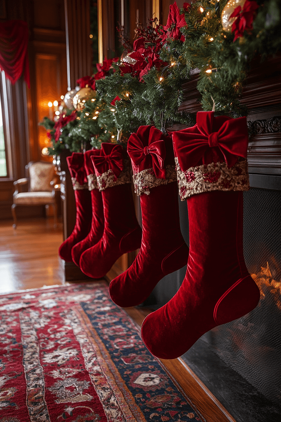 Bring classic richness into your home with christmas fireplace decor styled with velvet textures in deep festive colors. Velvet stockings add luxurious softness that pairs beautifully with warm lighting. Golden details enhance the timeless elegance. The whole display feels nostalgic and richly inviting.