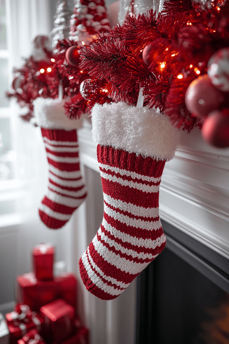 Boost cheerful energy around your hearth with christmas fireplace decor inspired by candy-cane stripes and bright red-and-white patterns. Striped stockings and bold ribbons bring lively seasonal personality. Twinkling lights add playful sparkle to the contrasting colors. Everything feels festive, fun, and joyfully spirited.