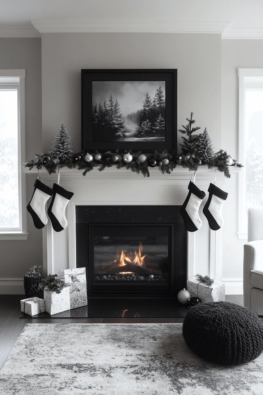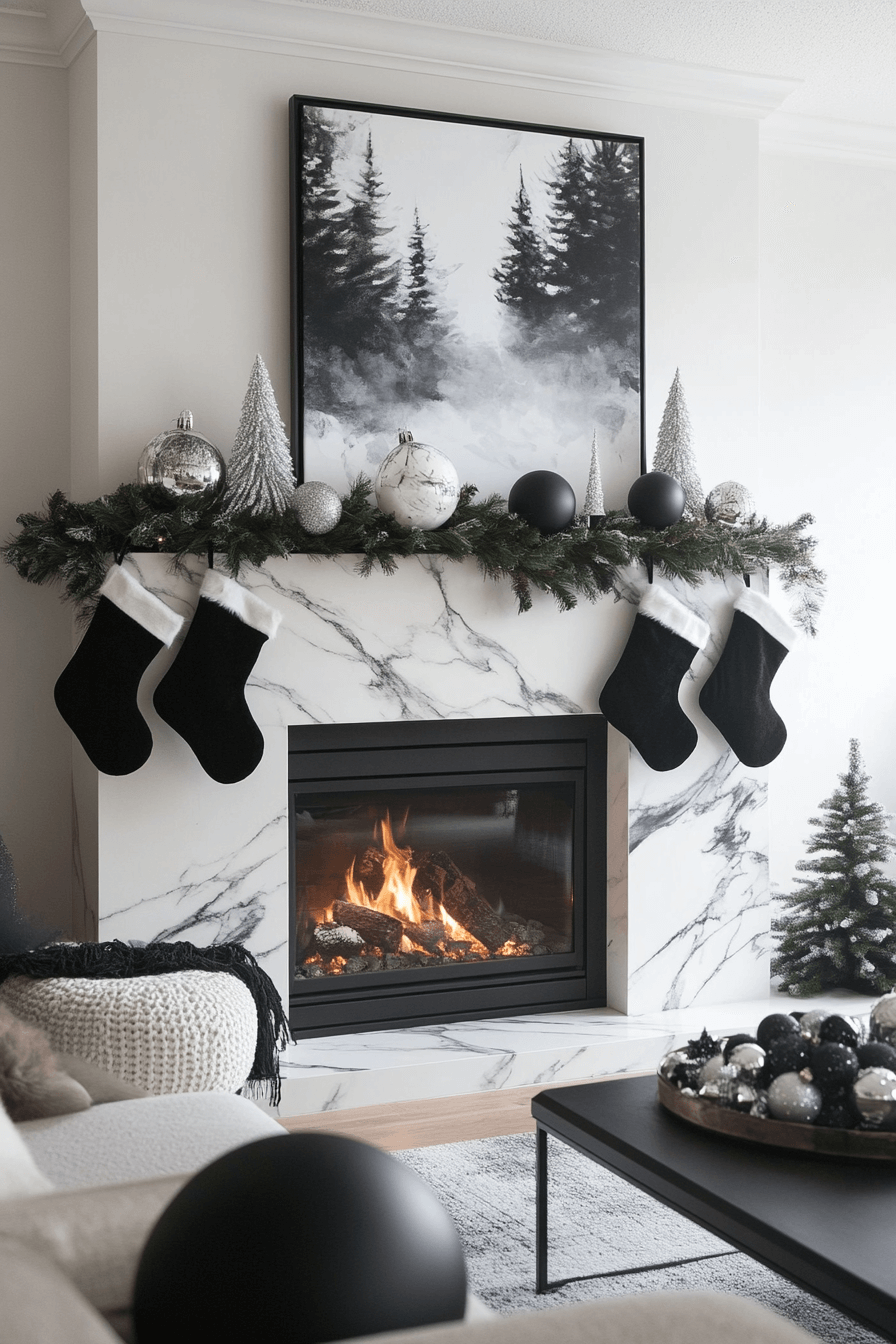 Define your contemporary holiday look with christmas fireplace decor arranged using bold black-and-white balance. Minimal shapes give modern structure and artistic appeal. Soft metallic touches elevate the contrast with festive refinement. The overall design feels sleek, confident, and strikingly stylish.