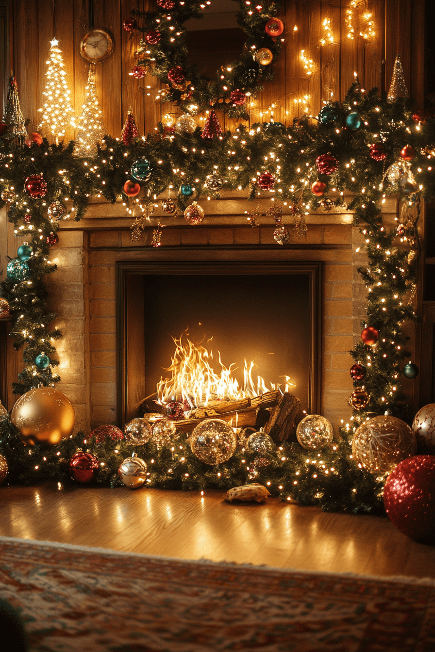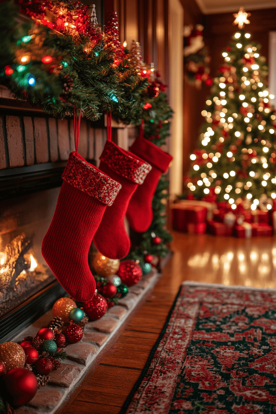 Spark excitement in your home with christmas fireplace decor featuring shimmering ornaments and bold metallic tinsel. Every reflective detail glows with festive intensity. Vibrant stockings and eye-catching accents amplify the modern holiday spirit. Firelight brings dramatic sparkle across the mantel.