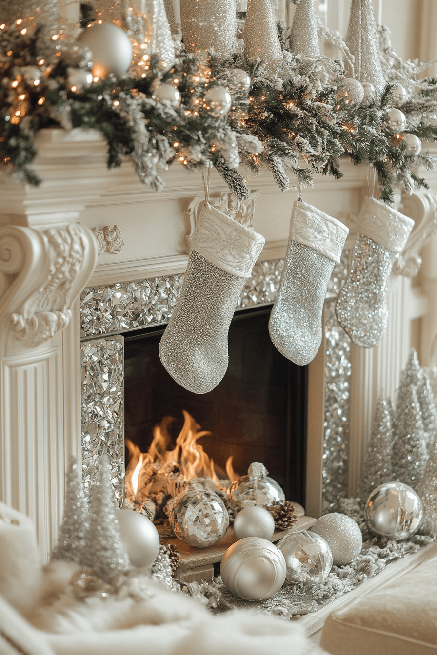Add evening sophistication with christmas fireplace decor enriched by crystal elements that reflect soft firelight beautifully. Mirrored ornaments elevate the shimmering effect. Crystal garlands contribute delicate sparkle perfect for nighttime glow. The entire arrangement feels refined, glamorous, and polished.