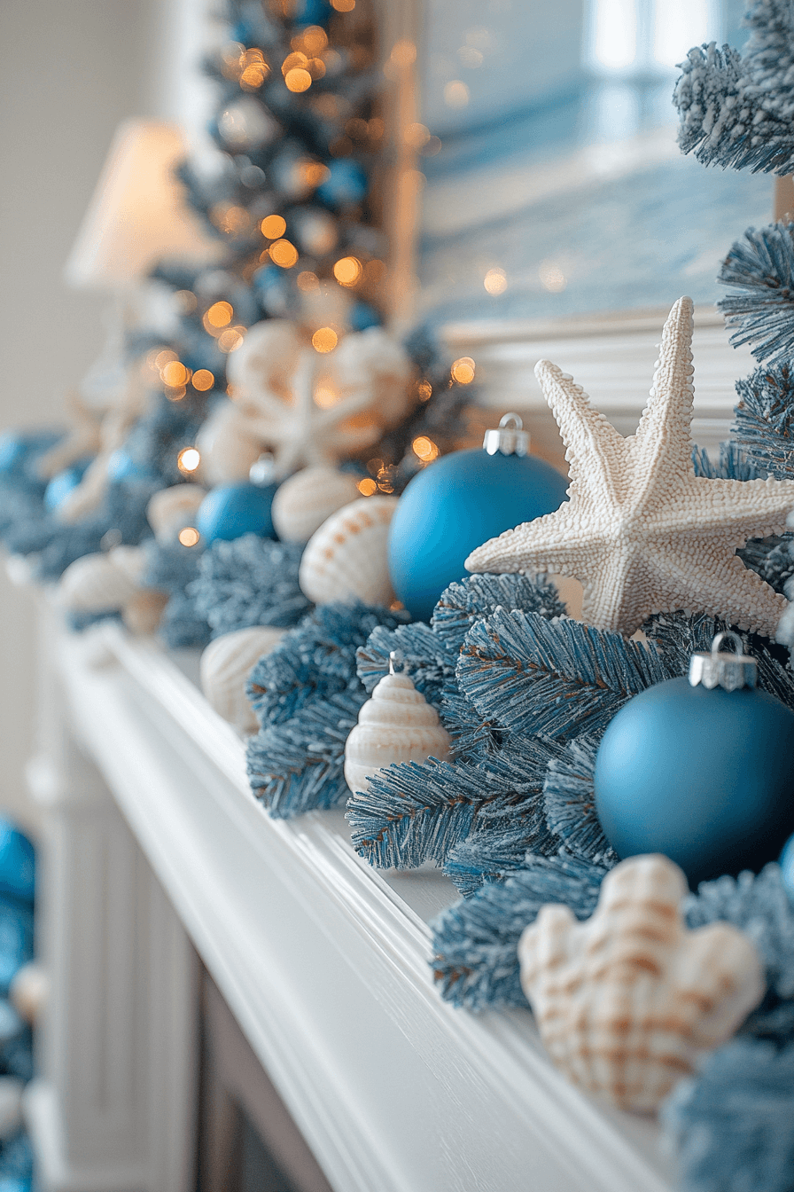 Introduce breezy seasonal relaxation with coastal-themed christmas fireplace decor mixing ocean blues and sandy whites. Shells and nautical motifs bring calm shoreline energy into your space. Light, airy hues create refreshing holiday brightness. This theme feels casual, peaceful, and uniquely festive.
