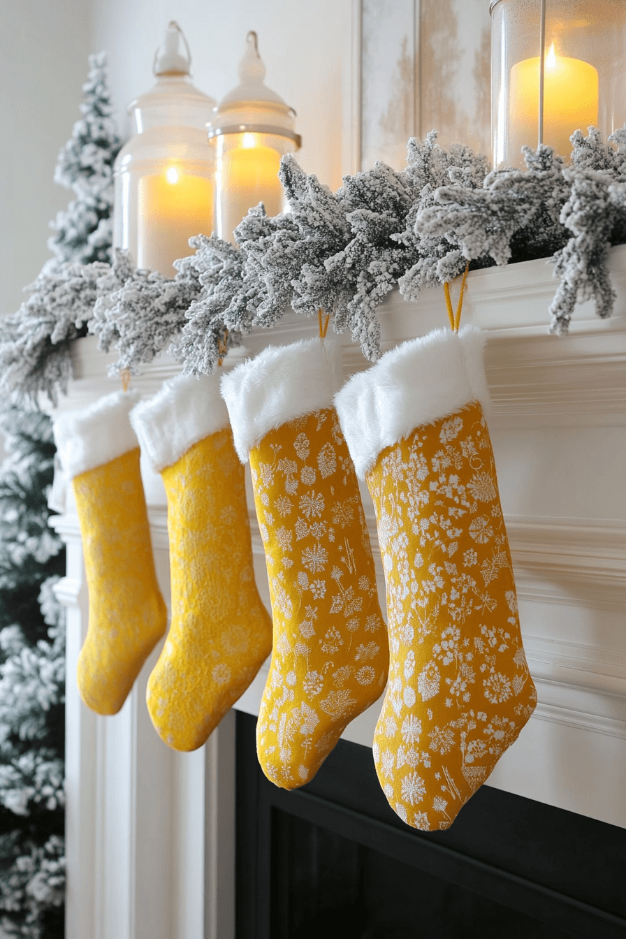 Infuse joyful vibrance into your home with christmas fireplace decor that pairs sunny yellow with clean white for spirited seasonal brightness. Bright stockings and light garlands radiate uplifting warmth. Gold hints add cheerful shine throughout the space. This look feels lively, happy, and refreshingly fun.