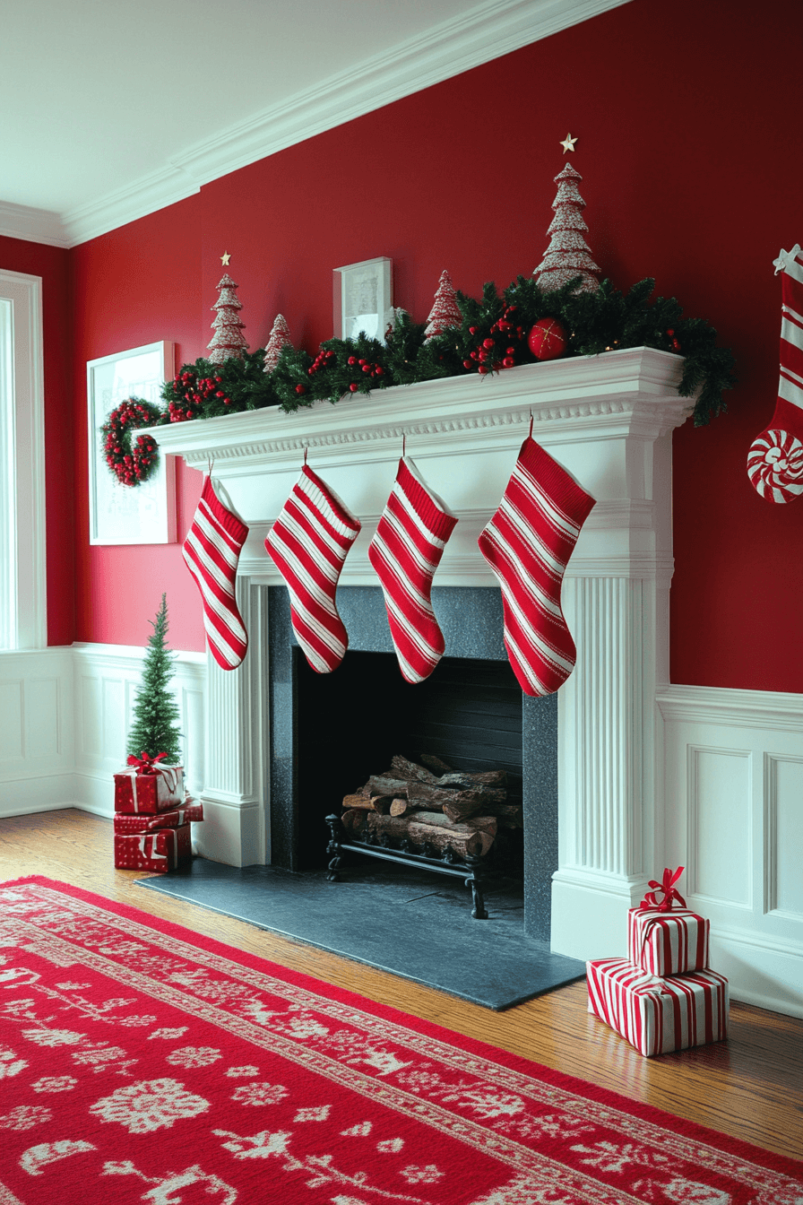 Introduce festive personality with christmas fireplace decor built around cheerful red-and-white stripes for candy-themed delight. Playful stockings and ribbon create bold holiday charm. Green garlands help balance the vibrant palette. Everything feels whimsical and family-friendly.