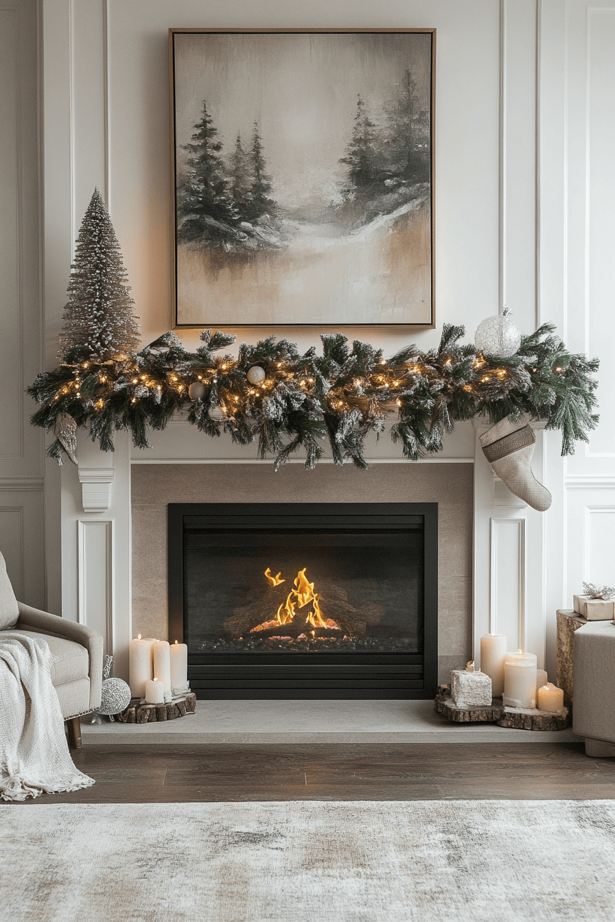 Immerse your home in Nordic serenity with christmas fireplace decor built from muted tones, raw woods, and simple textures. Soft grays and whites encourage peaceful seasonal harmony. Natural accents add warm Scandinavian authenticity. Light greenery completes the calm Nordic feel.