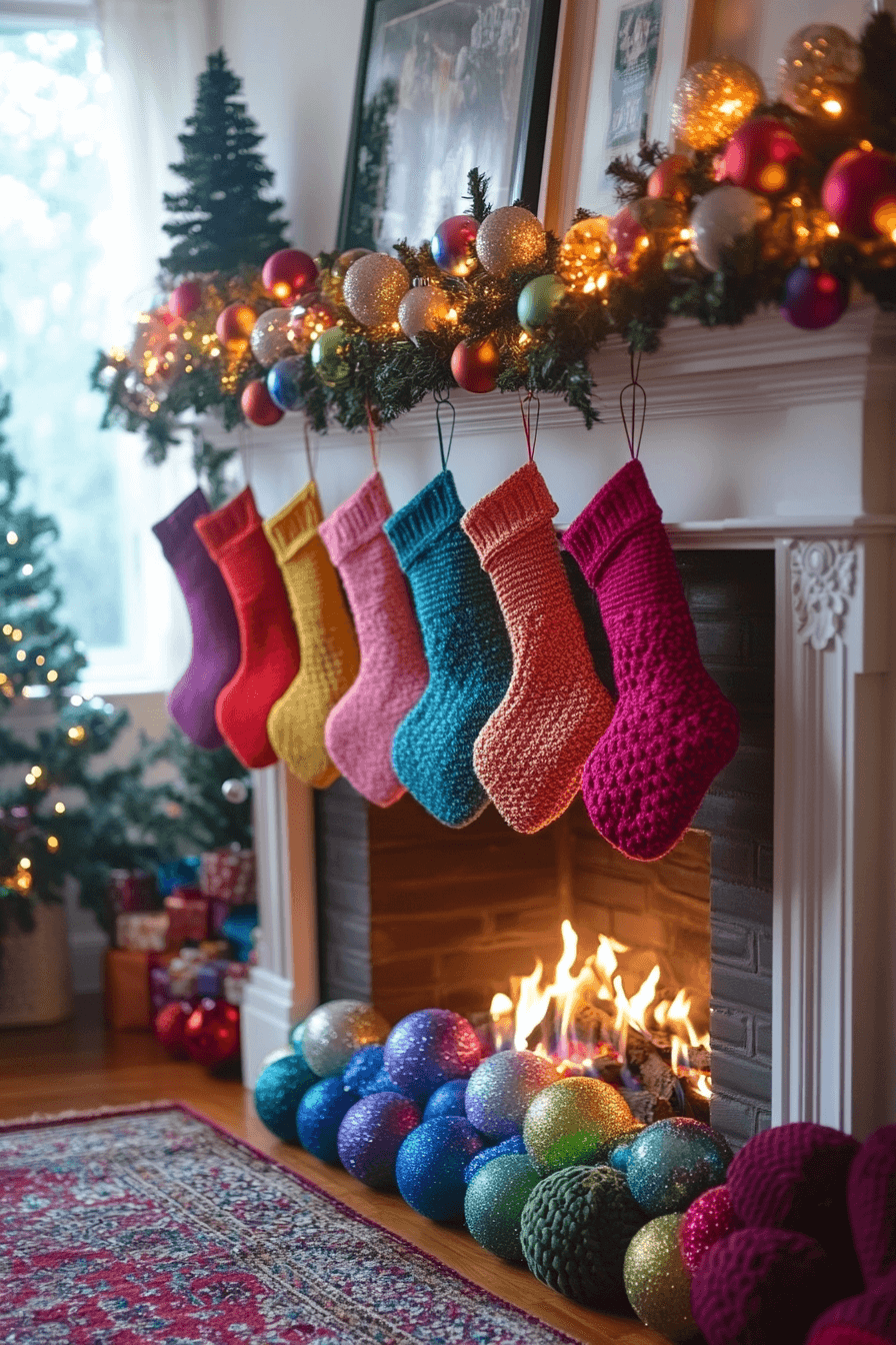 Unleash colorful holiday joy with christmas fireplace decor decorated in rainbow tones for lively festive expression. Multicolored accents brighten the mantel with fun, spirited energy. Every shade contributes fresh seasonal vibrance. The space feels expressive, playful, and full of personality.