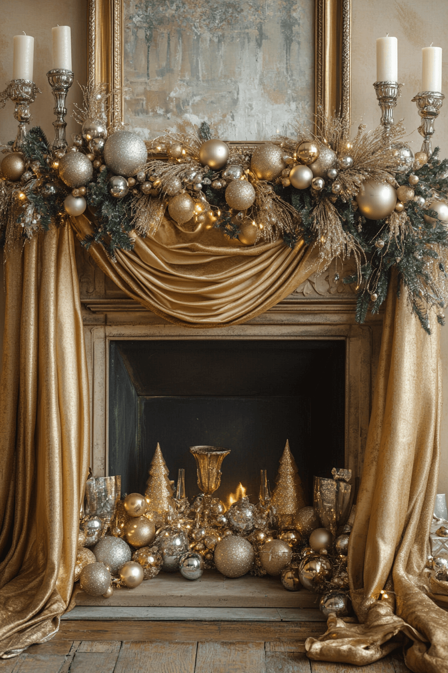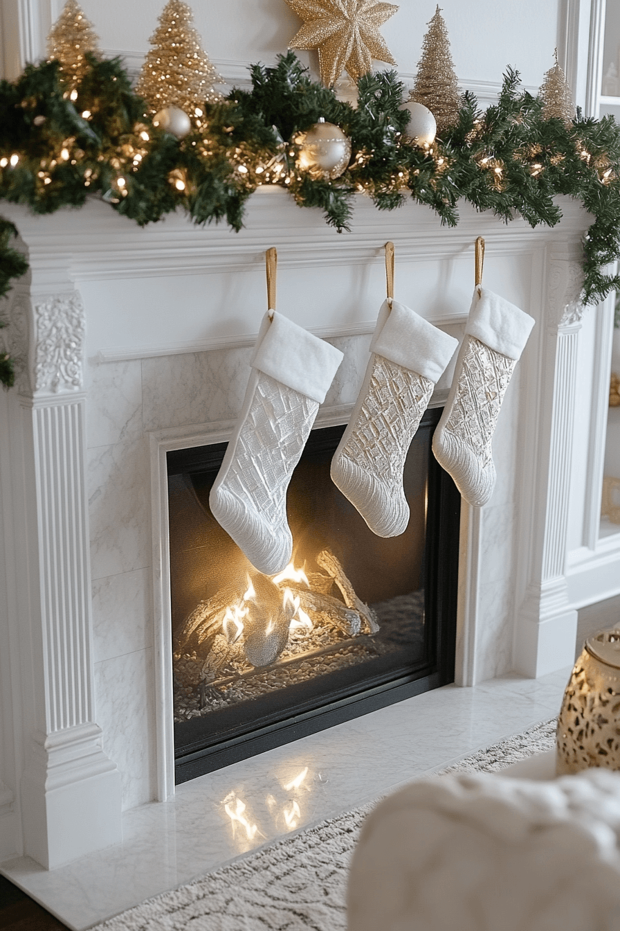 Elevate your holiday glow with christmas fireplace decor built from gleaming metallics that shine brilliantly under firelight. Gold and silver elements reflect warm light with luxurious brilliance. Shimmering garlands and sparkling stockings heighten the festive sophistication. The overall mood feels radiant and perfect for lively celebrations.