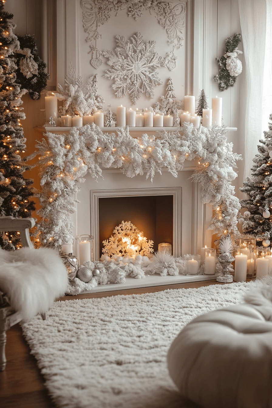 Uplift your winter atmosphere with christmas fireplace decor designed in snowy whites that create peaceful seasonal calm. Soft textures and frosted accents bring dreamy, gentle charm to your mantel. Silver hints add delicate sparkle without overwhelming the quiet palette. The entire look blends easily into both muted and colorful interiors.