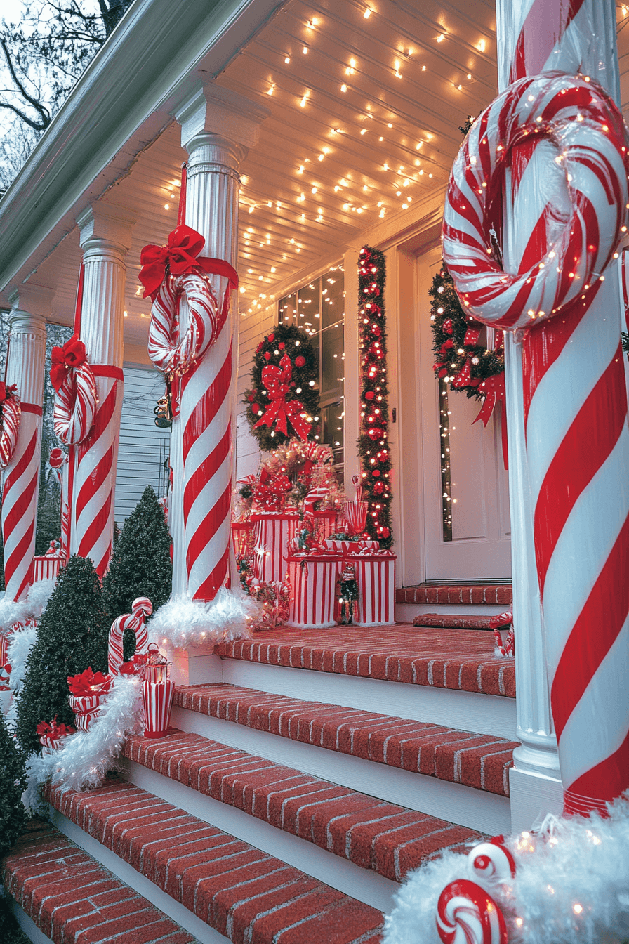 Candy cane colors bring cheerful playfulness to Christmas porch decor inspired by sweet holiday treats. Bright red stripes, swirled signs, and fun peppermint props create an upbeat theme. This look stands out beautifully in family-friendly spaces. Every decoration contributes to a cheerful, whimsical mood. Explore beautiful outdoor christmas planters options.