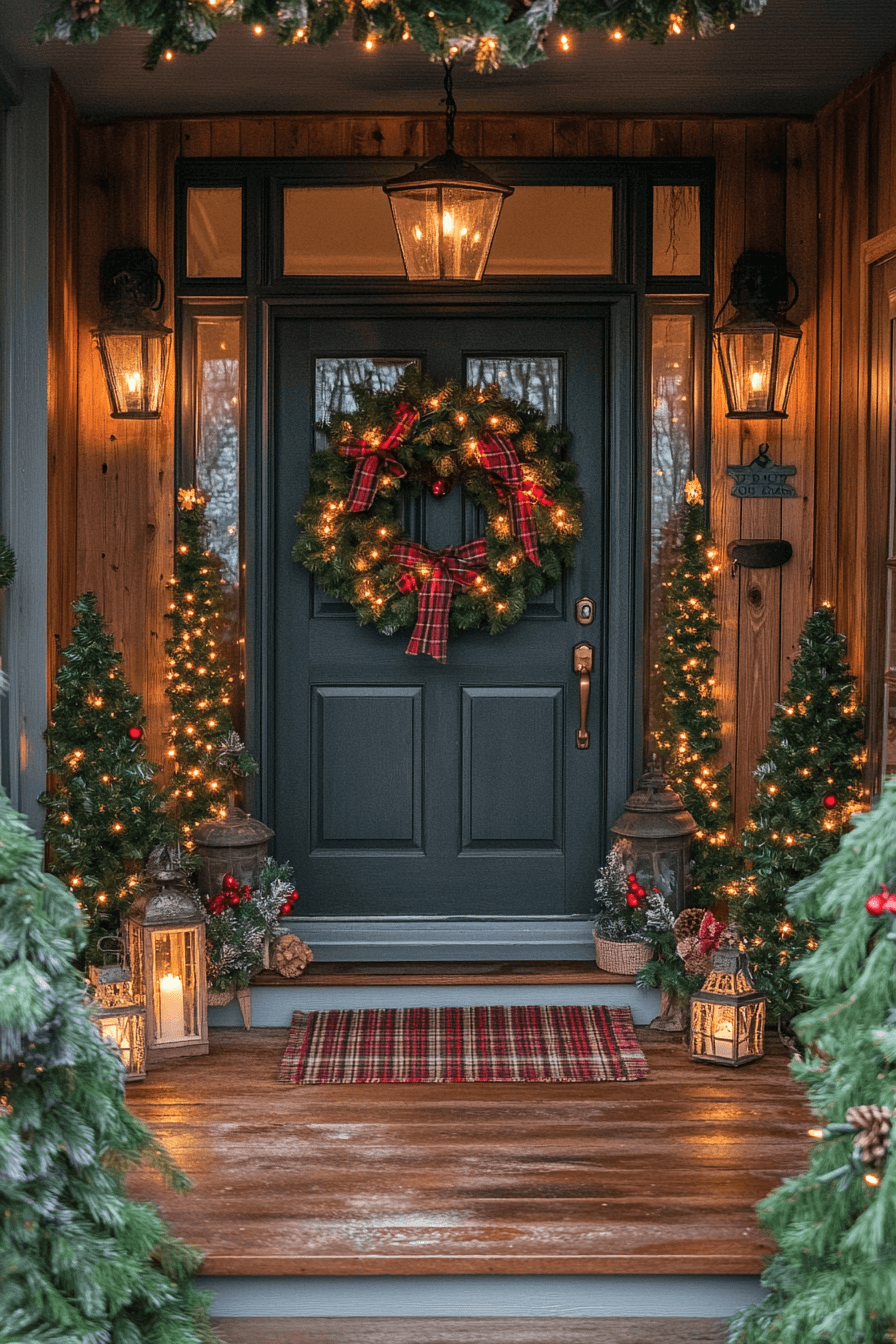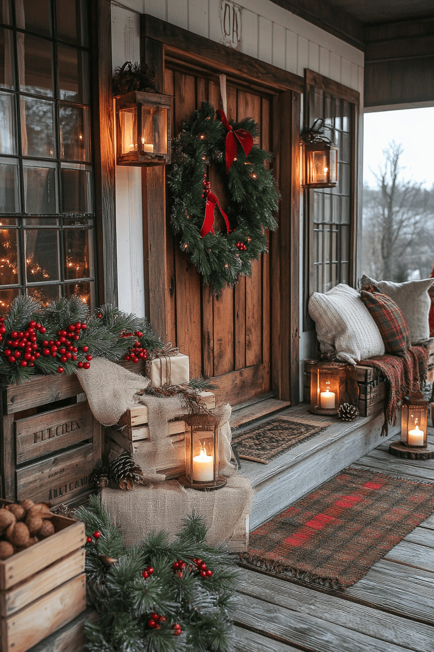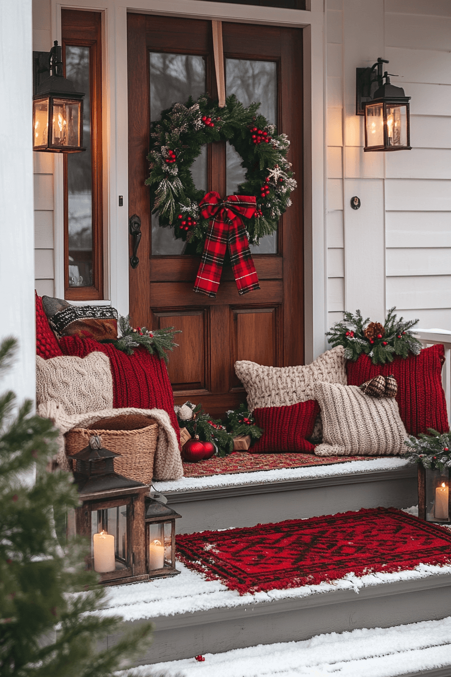 Warm textures and cozy accents make Christmas porch decor feel like a comforting welcome every time someone arrives. Plaid throws, lantern lights, and soft pillows layer the entry with seasonal charm. Red and green tones build a classic holiday mood that feels cheerful and inviting. Warm lighting reinforces the overall homey feel.