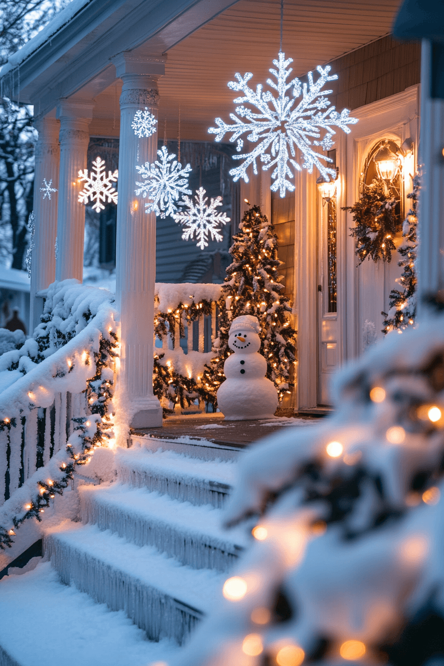 Snowflake-inspired Christmas porch decor creates a magical, snowy ambiance with soft silver accents and delicate shapes. Hanging snowflakes sway lightly, casting lovely shadows in the glow of nearby lights. Cool tones enhance the wintry calm of the space. The overall effect feels gentle and beautifully understated. Explore beautiful lighted gift boxes options.