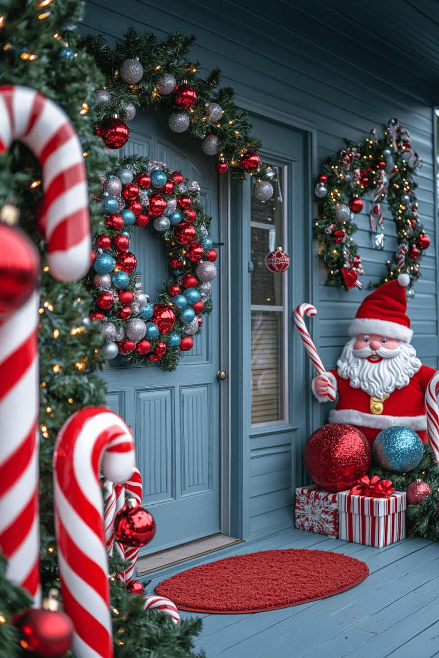 Oversized ornaments and vibrant colors bring joyful boldness to Christmas porch decor that loves to stand out. Multicolored lights and giant bows add a sense of playfulness and excitement. Every detail expresses personality and holiday cheer. This look works perfectly for homes that enjoy festive flair.