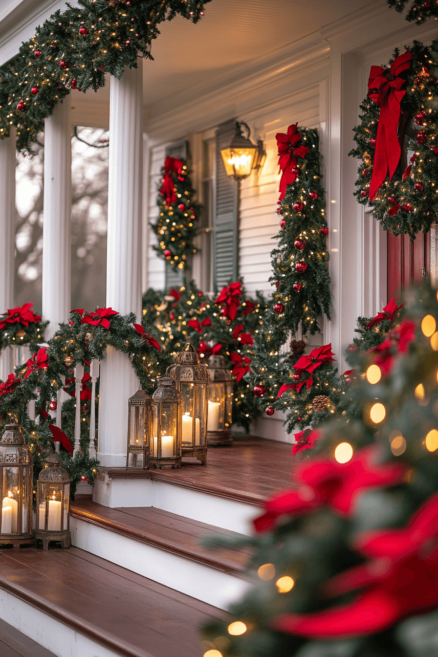 Garland-wrapped stair rails and sparkling lights give dramatic height to Christmas porch decor that highlights your steps. Ribbon details and ornaments add texture and rhythm to the arrangement. The staircase instantly becomes a holiday focal point. This layered look adds elegance without overwhelming the porch.