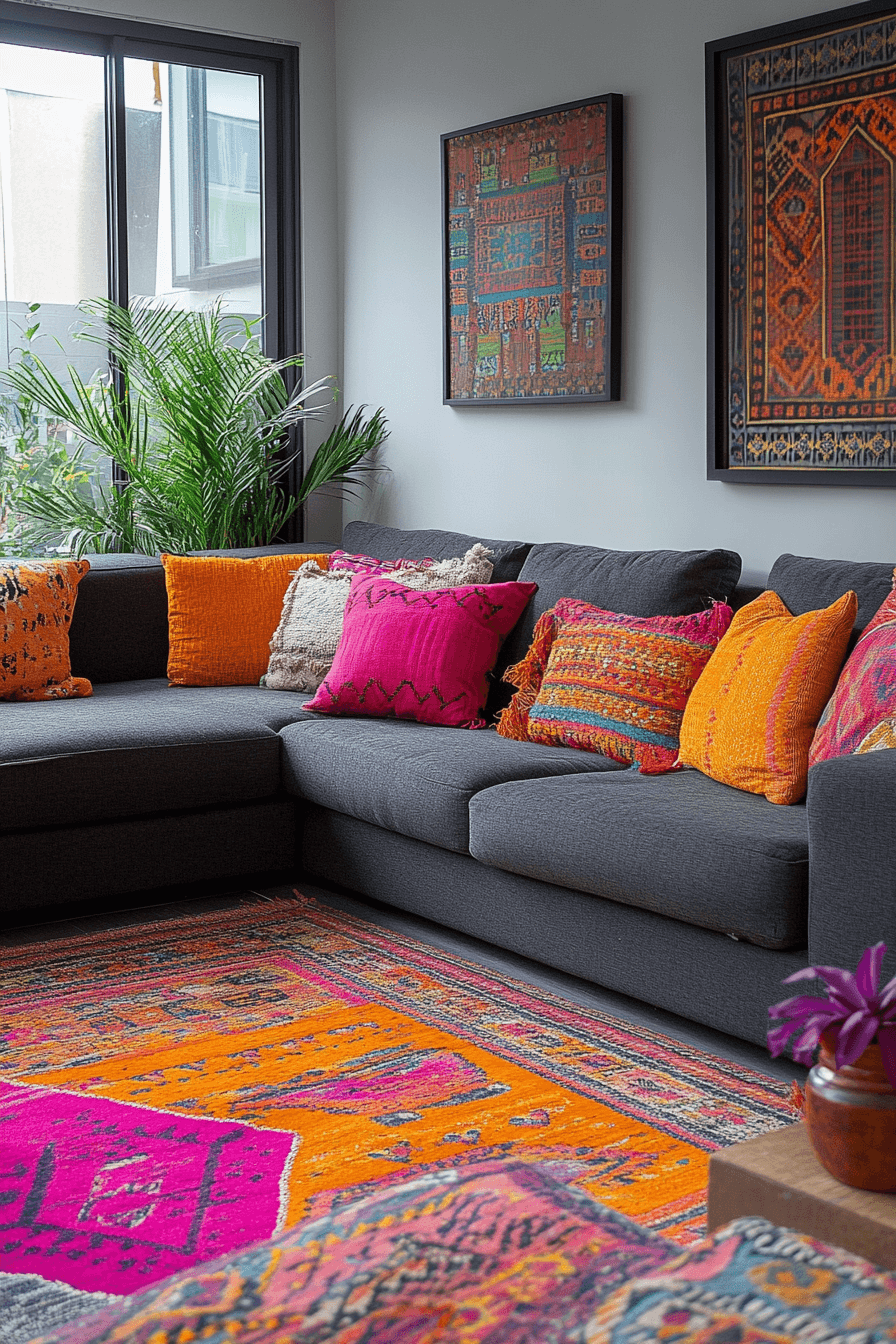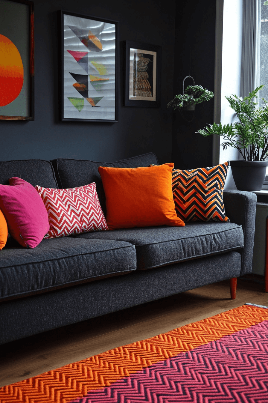 Playful color accents breathe energy into a dark grey couch living room with creative flair. Vibrant decor pieces stand out dramatically against the neutral sofa. The grey foundation keeps the palette cohesive. The result feels joyful and expressive. Personality shines through every detail. Add bright accents and make your living room uniquely yours today.