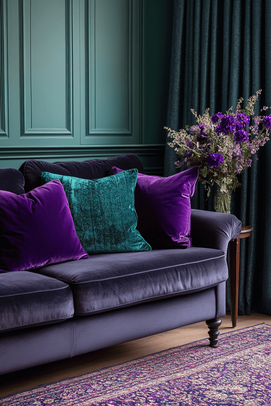 Emerald, ruby, and sapphire accents introduce jewel-like brilliance to a dark grey couch living room. The saturated hues glow against the cool grey base. Velvet and satin finishes heighten the luxurious effect. The sofa keeps the palette grounded and cohesive. The room feels glamorous yet inviting. Add rich jewel tones and elevate your living room beautifully today.