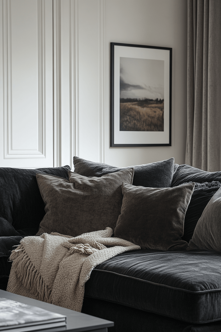 Velvet textures instantly amplify the elegance of a dark grey couch living room. Plush cushions and drapery reflect light softly for added depth. The tactile richness contrasts beautifully with the matte sofa. The layered look feels indulgent and cozy. The room exudes warmth without losing sophistication. Introduce velvet accents and experience next-level comfort now.