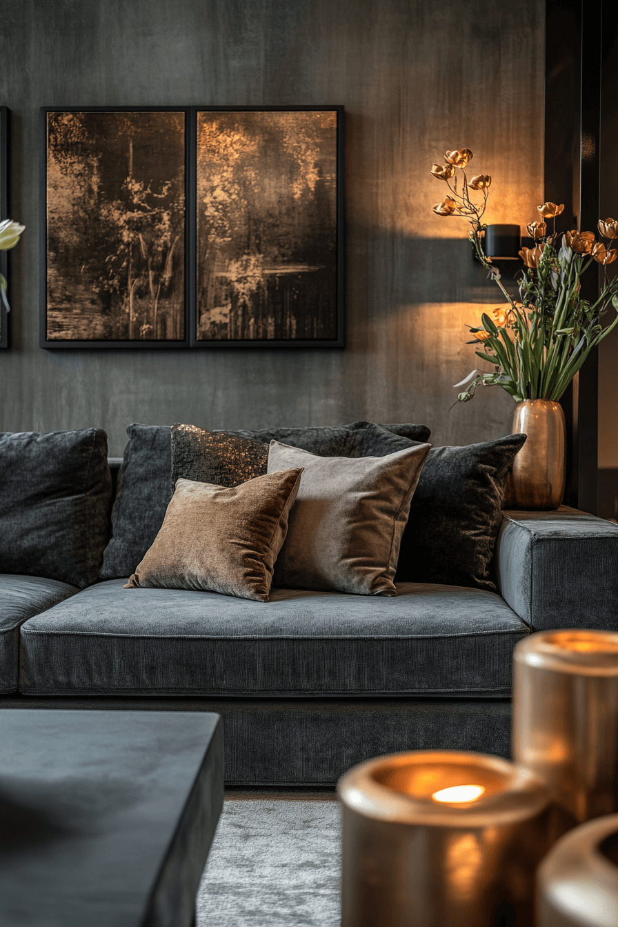 Hints of brass or champagne finishes can add warmth to a dark grey couch living room. Metallic details introduce subtle radiance. The shimmer contrasts gracefully with deep upholstery. Carefully placed lighting enhances every reflective surface. The atmosphere feels polished and refined. Add luminous accents and elevate your grey living room instantly.