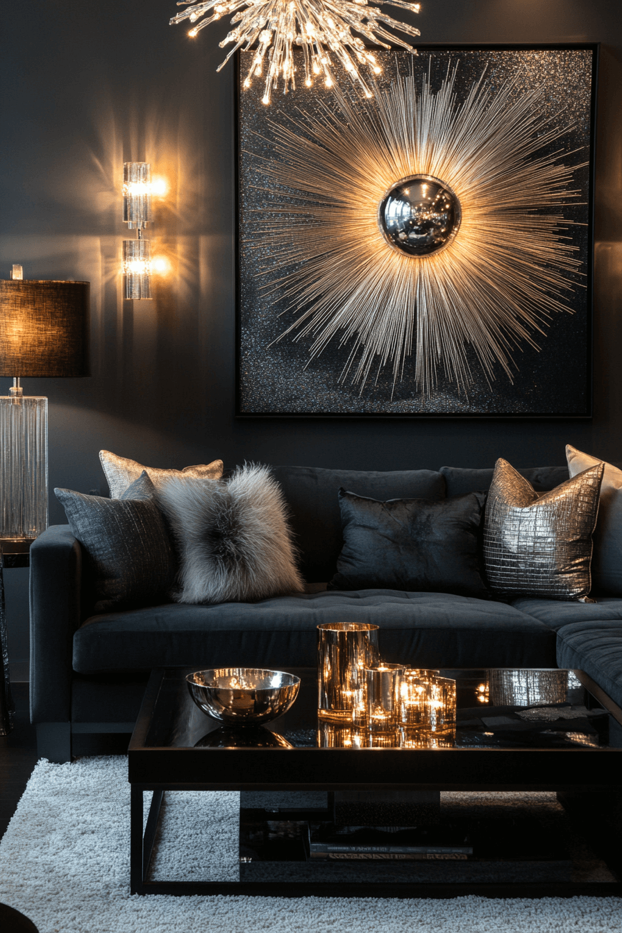 Reflective finishes subtly enhance a dark grey couch living room with understated glam. Metallic trays, mirrors, and decor amplify available light. The contrast between shine and matte upholstery feels balanced. Gentle lighting deepens the cozy glow. The space feels elegant yet welcoming. Add shimmering details and let your living room glow today.