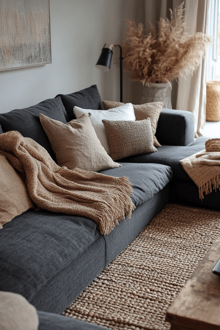 A layered mix of wool, linen, and leather enriches a dark grey couch living room. Each texture contributes dimension and comfort. The sofa unifies the diverse materials seamlessly. Lighting enhances depth and richness. The design feels indulgent but livable. Combine tactile elements and transform your living room beautifully today.