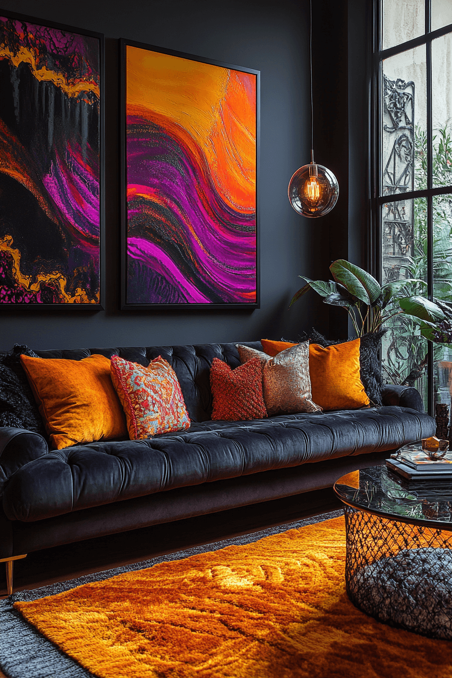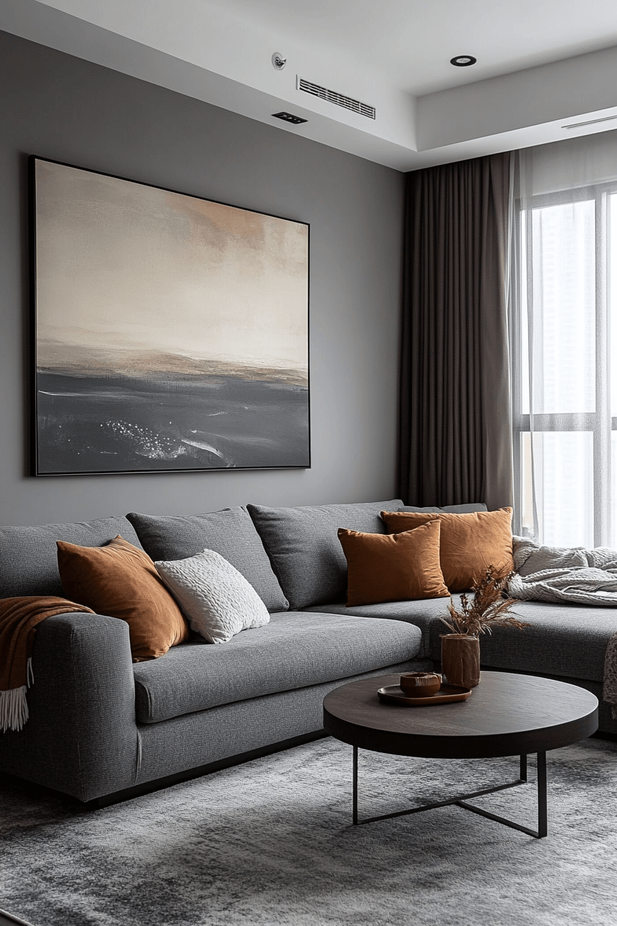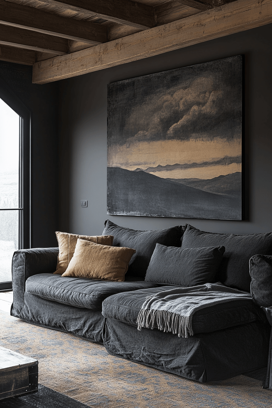 Oversized artwork can redefine a dark grey couch living room with expressive flair. The sofa acts as a striking canvas for bold, large-scale pieces. Graphic prints and abstract colors inject personality. The dark foundation makes artwork appear even more vibrant. The space feels curated and creative. Let statement art steal the spotlight and transform your living room today.