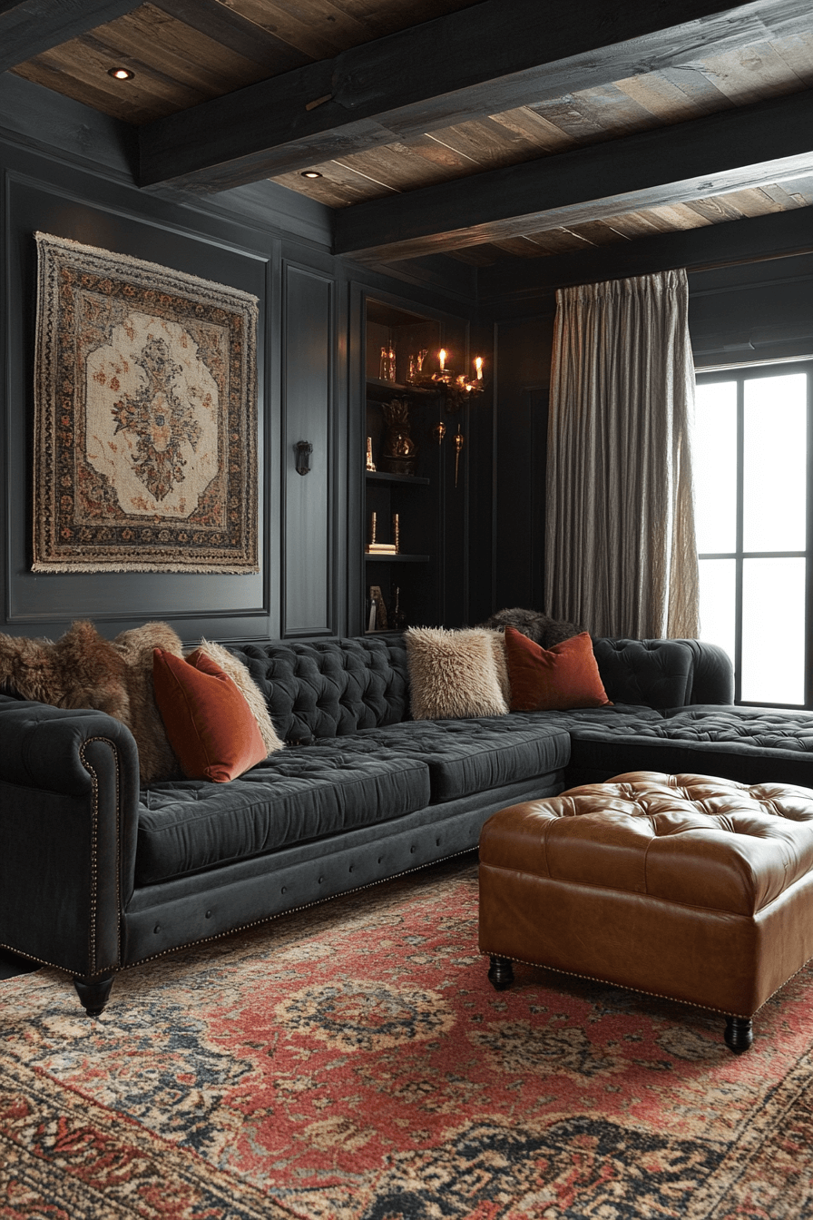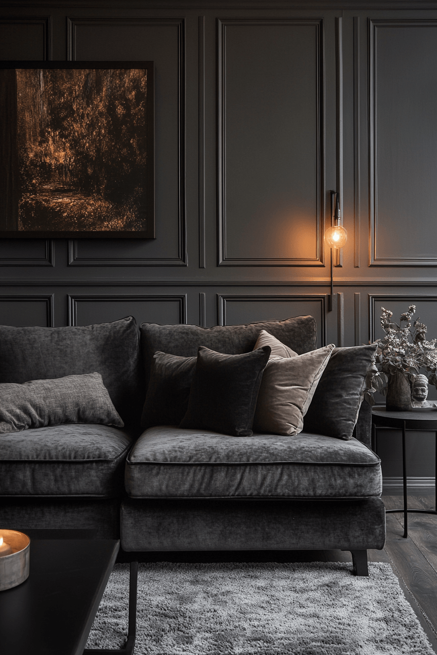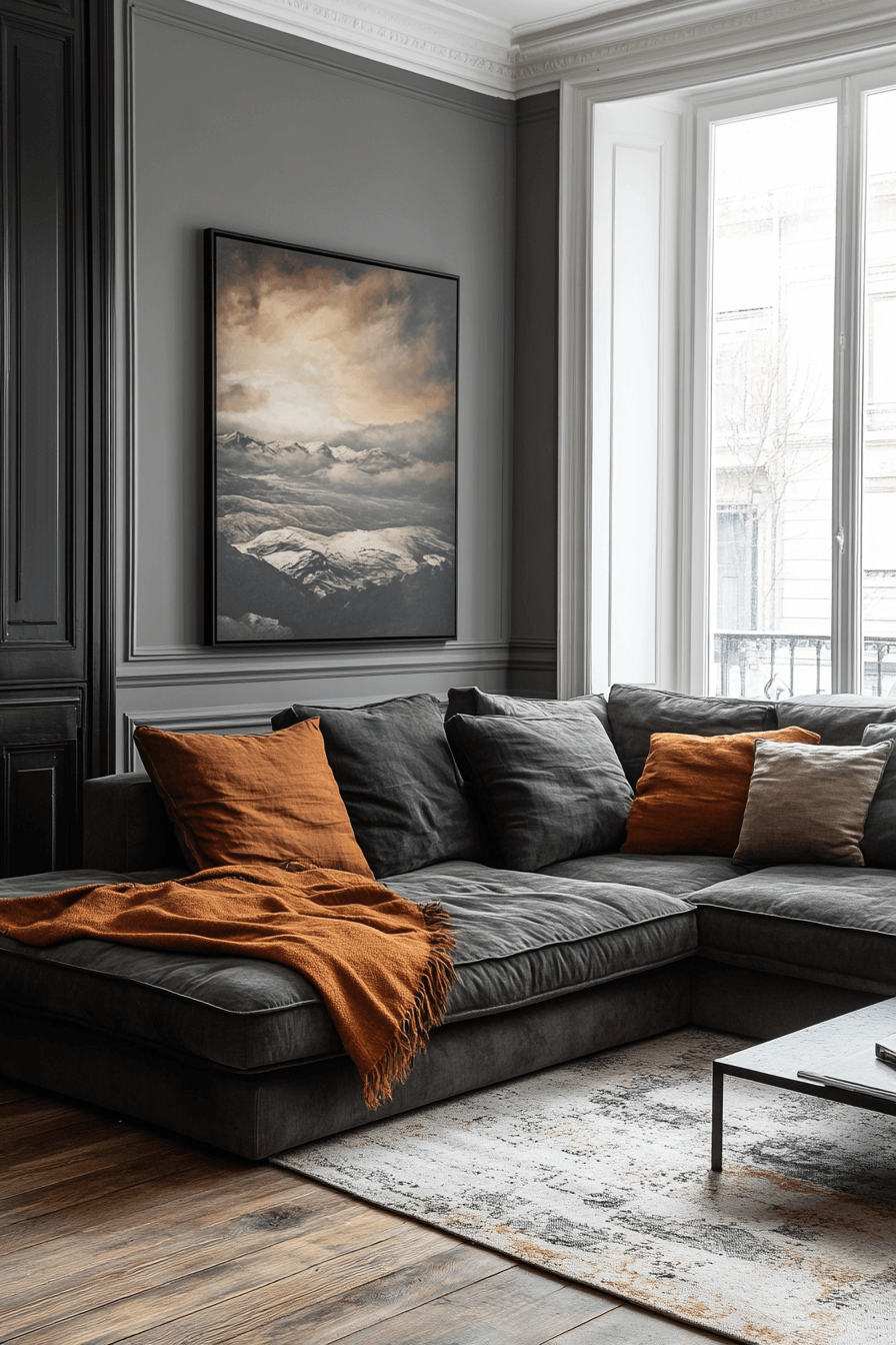 Layering charcoal tones builds moody sophistication in a dark grey couch living room. Dark walls or deep rugs intensify visual impact. Crisp accents keep the palette dynamic. Strategic lighting defines texture and depth. The atmosphere feels bold yet refined. Embrace rich layering and reinvent your space confidently now.