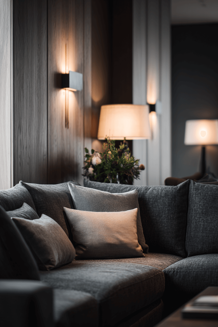 Warm lighting dramatically shifts the mood of a dark grey couch living room. Soft-glow lamps and dimmers enhance the cozy ambiance. The grey upholstery reflects light gently without glare. Evenings feel calm and intimate. The space encourages relaxation and connection. Illuminate your living room thoughtfully and enjoy peaceful nights now.