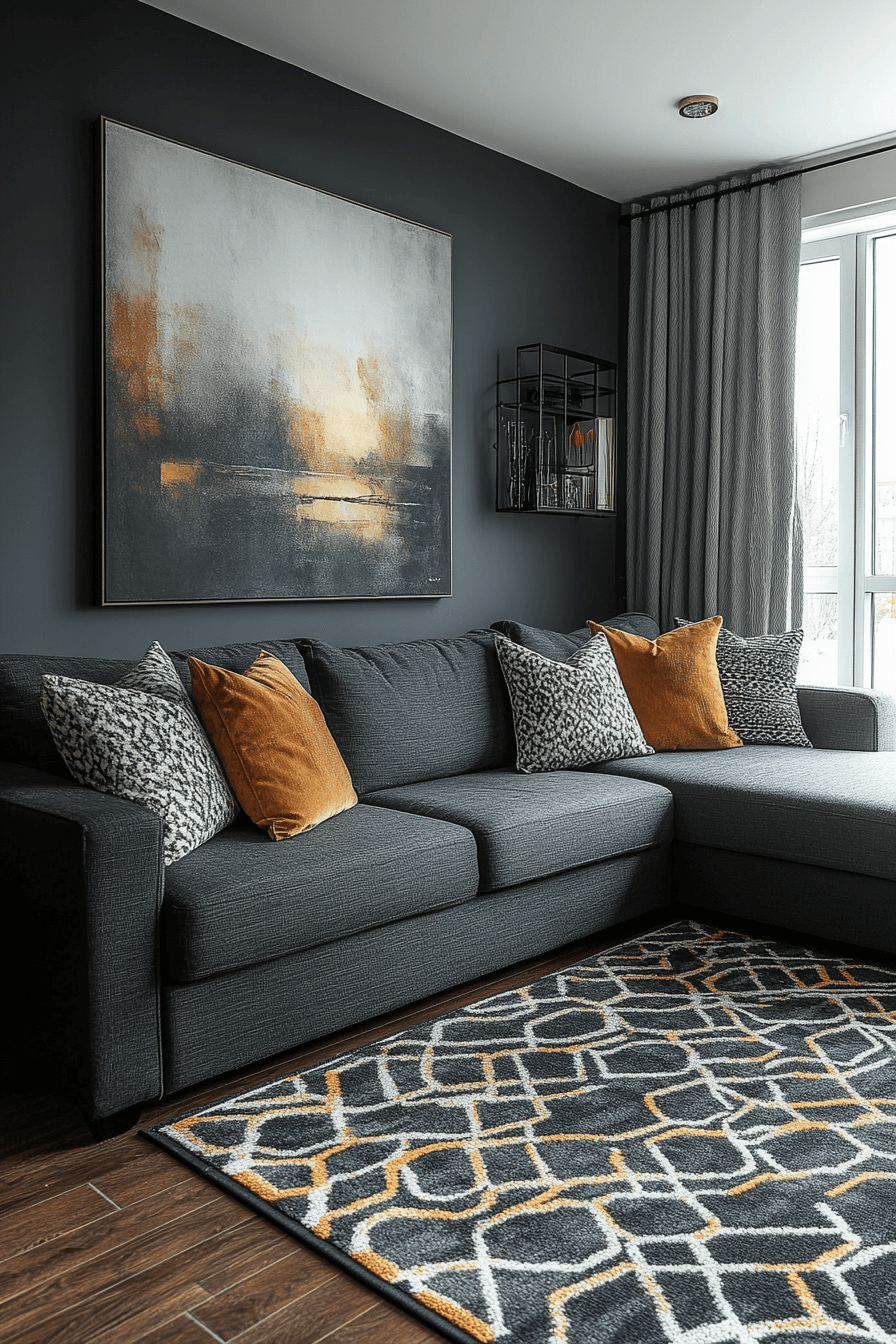 Angular patterns add visual energy to a dark grey couch living room. Structured rugs and geometric prints create rhythm and movement. The solid grey base anchors the design. The result feels contemporary and bold. Balanced placement keeps everything harmonious. Introduce graphic flair and refresh your space instantly.