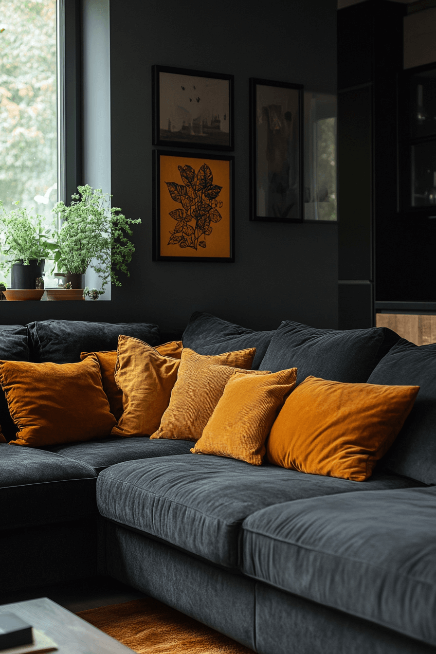 Burnt orange, rust, and mustard accents can warm a dark grey couch living room beautifully. These earthy hues glow vibrantly against the cool foundation. Plush textiles add softness and personality. The balance feels dynamic yet grounded. The space becomes lively and inviting. Add warm tones and energize your living room now.