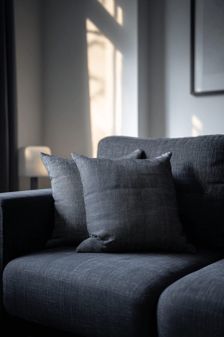 Refined detailing adds quiet luxury to a dark grey couch living room. Subtle embroidery and elegant fabrics elevate the overall feel. The sofa anchors the polished design effortlessly. Minimal decor maintains a curated look. The ambiance feels intentional and graceful. Introduce understated refinement and elevate your space now.