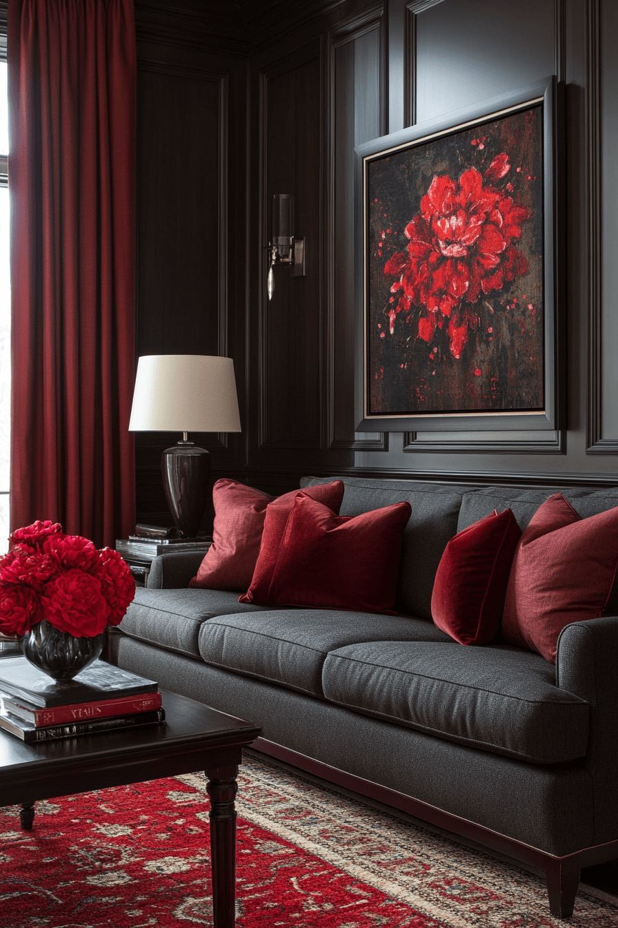 Moody plum and deep berry hues add layered richness to a dark grey couch living room. The cool grey upholstery pairs beautifully with wine-inspired accents for a cozy yet dramatic look. Plush textiles enhance the inviting feel. The palette feels intimate without being heavy. Subtle lighting deepens the warmth. Introduce berry-toned accents and create an irresistible living room retreat today.