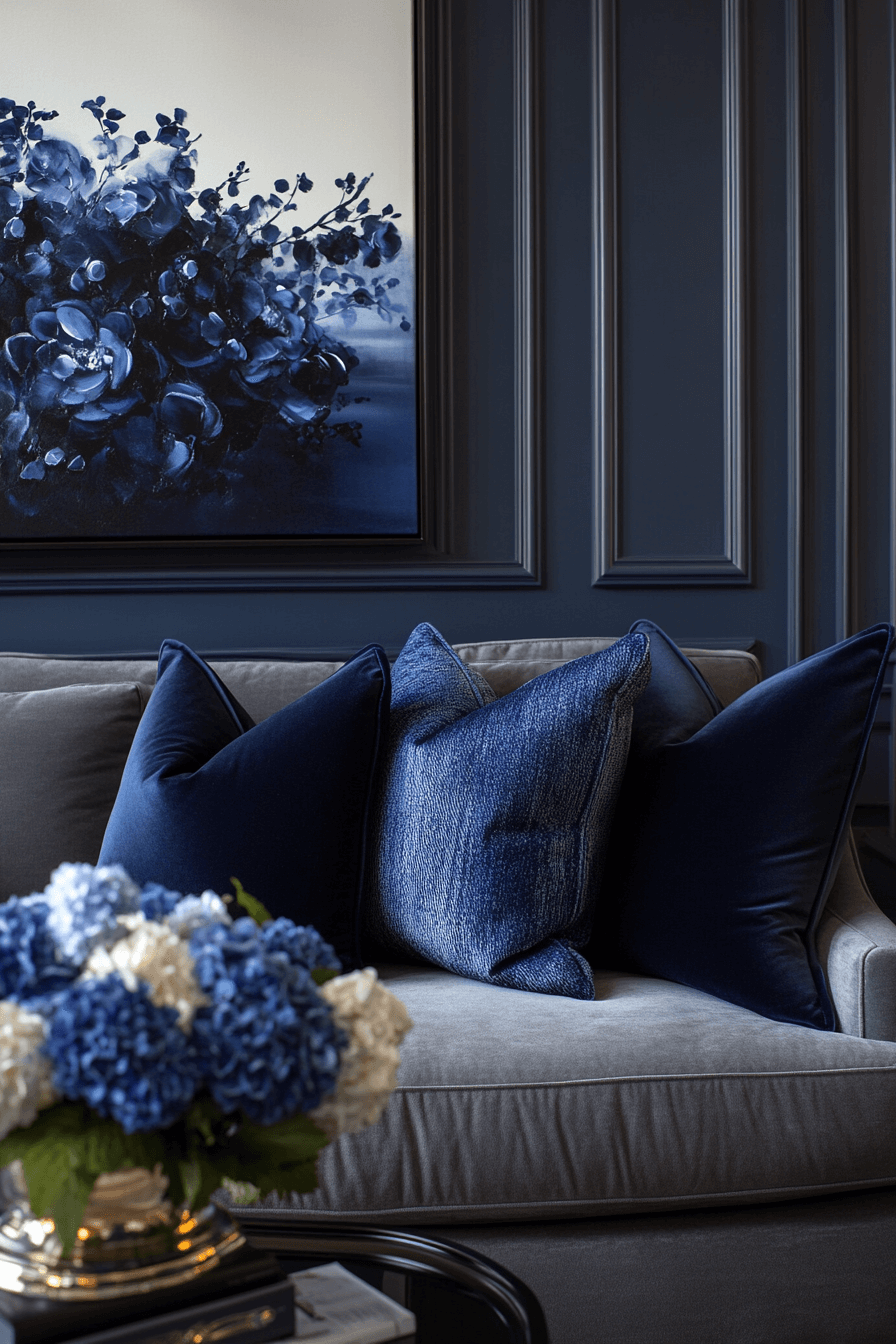 Classic navy details elevate a dark grey couch living room with depth and structure. The pairing feels tailored and timeless. Navy curtains or side chairs reinforce the sophisticated mood. Silver or chrome decor enhances the refined edge. The space becomes calm yet commanding. Refresh your living room with this confident navy-and-grey combination now.
