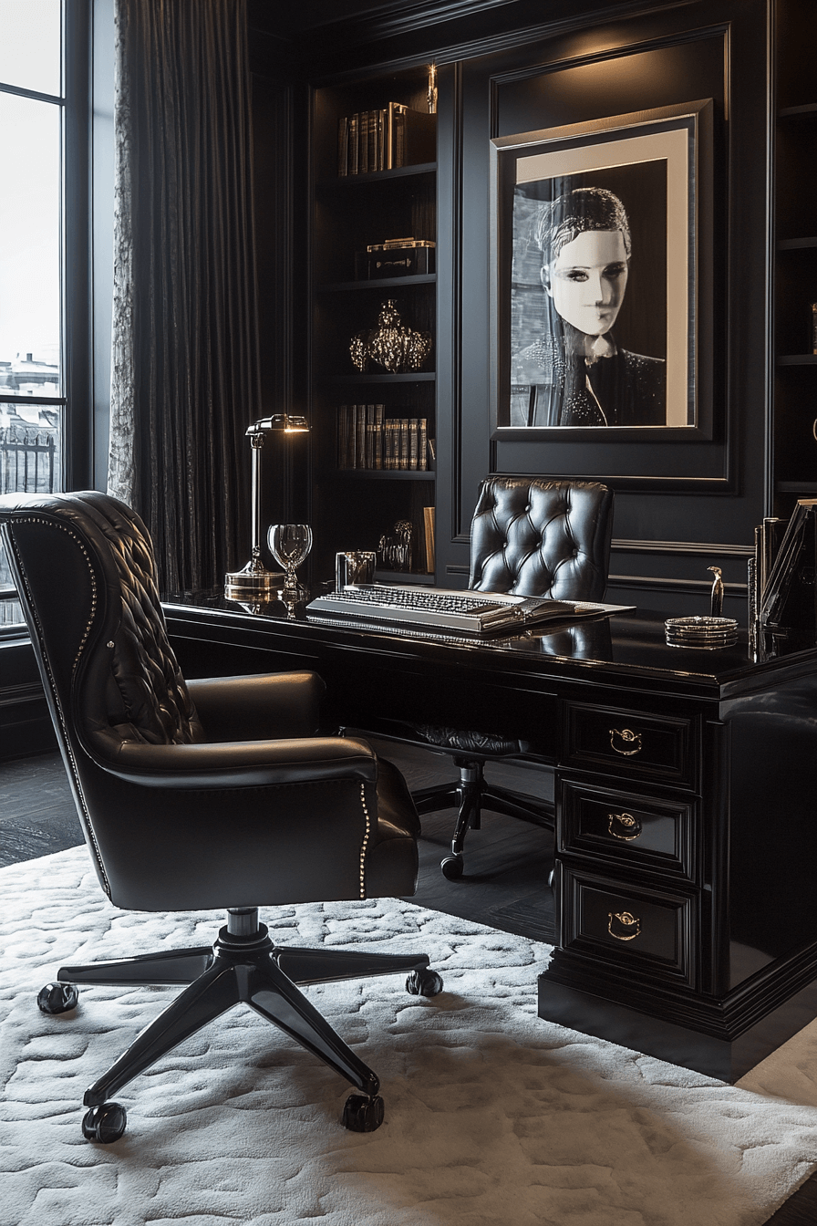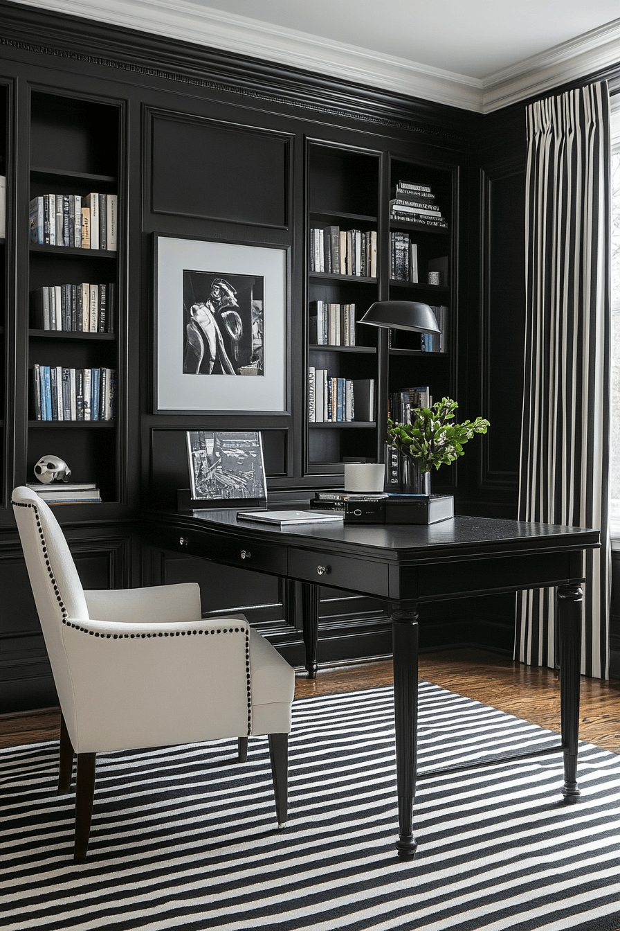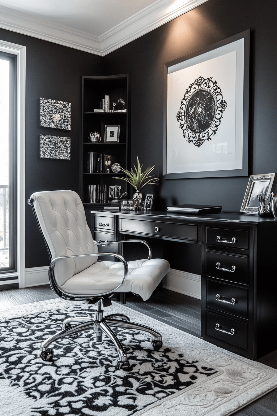 A strong black-and-white scheme can give an elegant home office a timeless look with bold professional presence. Bright walls help the room feel crisp and spacious, while dark furniture adds depth and sophistication. Clean patterns and geometric details keep the space visually interesting without overwhelming the work area. The contrast creates a sharp, organized environment that supports concentration. The finished office feels classic, confident, and effortlessly refined. Click to discover more inspiration for a striking black-and-white elegant home office!