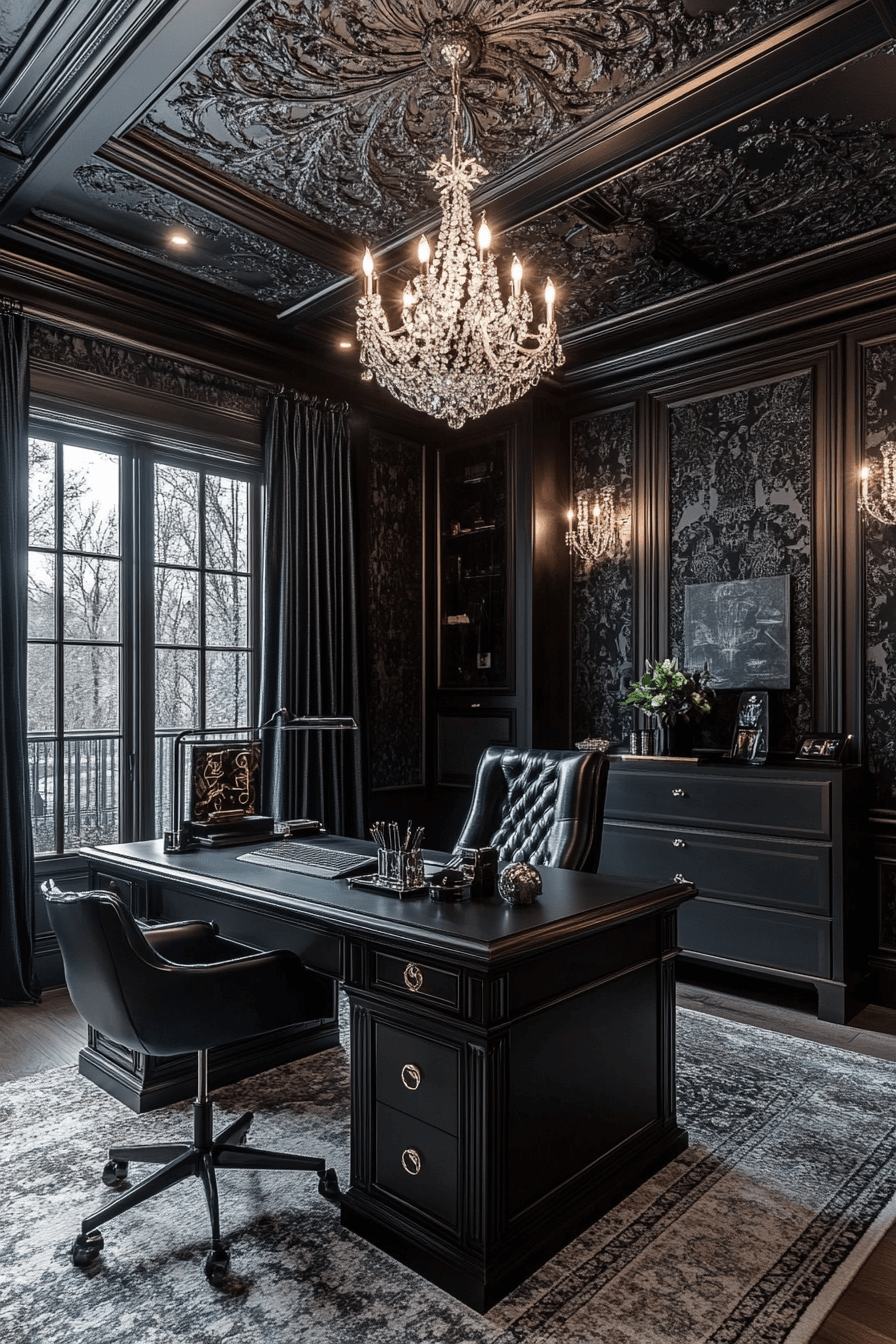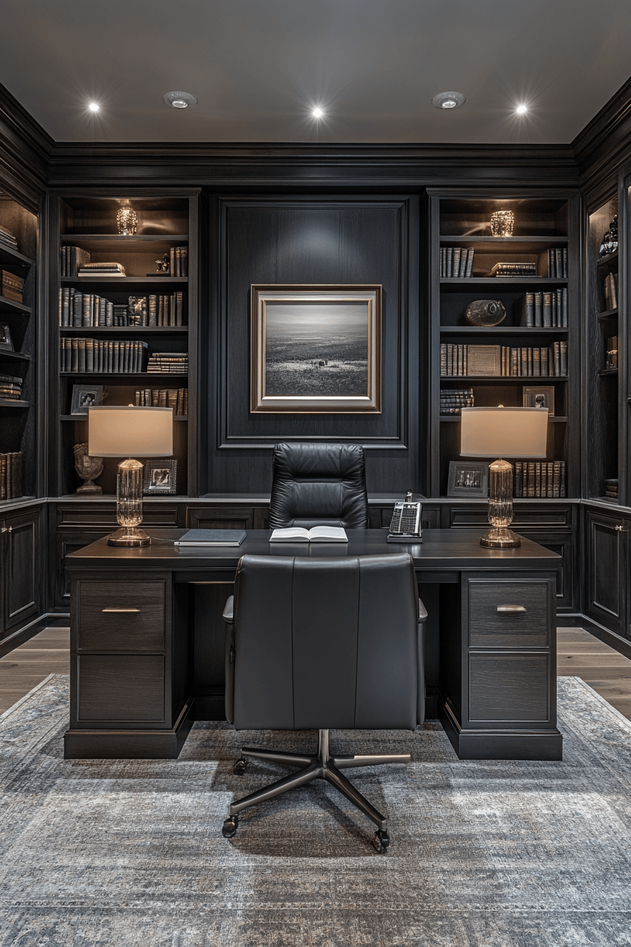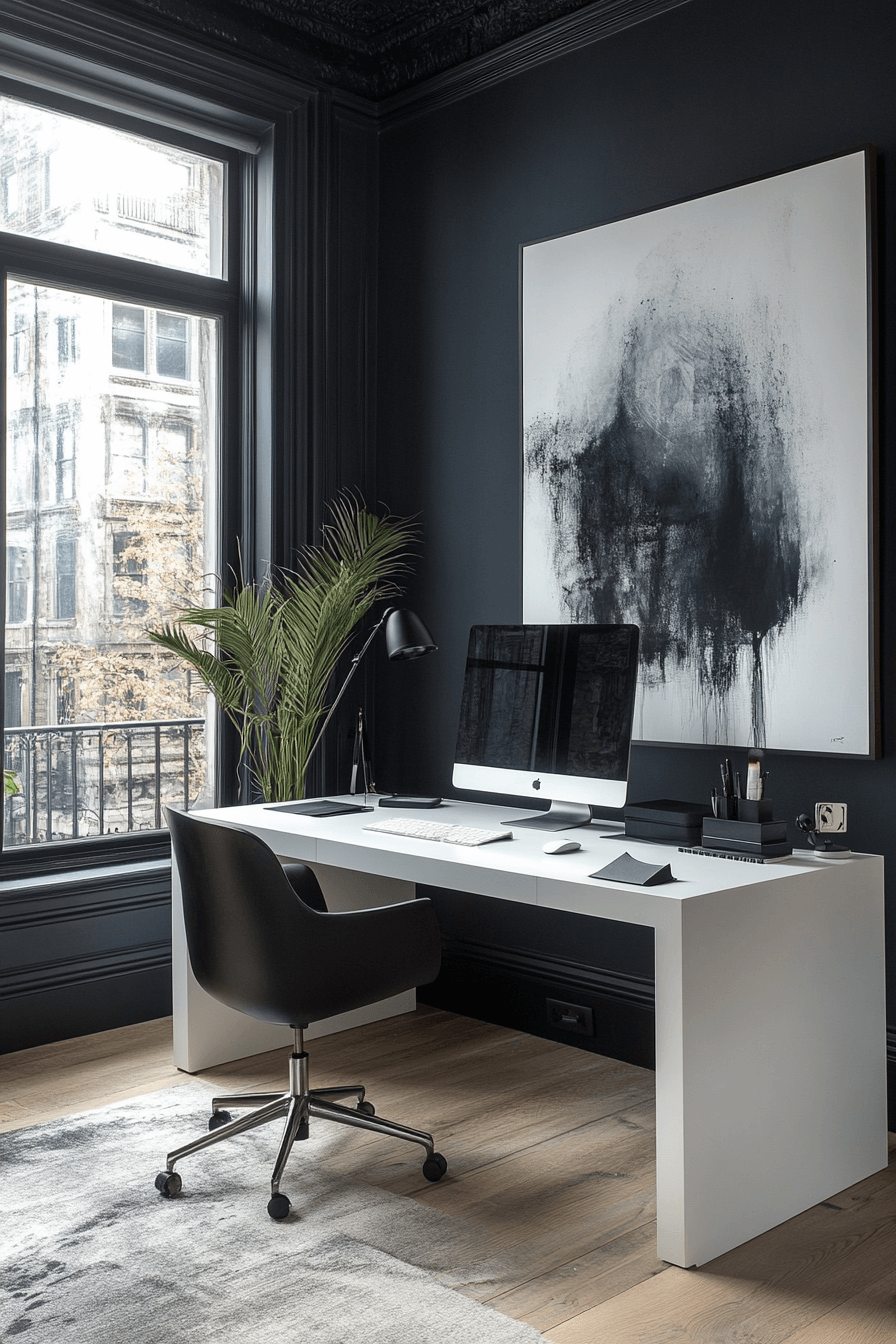 A strong black-and-white scheme can give an elegant home office a timeless look with bold professional presence. Bright walls help the room feel crisp and spacious, while dark furniture adds depth and sophistication. Clean patterns and geometric details keep the space visually interesting without overwhelming the work area. The contrast creates a sharp, organized environment that supports concentration. The finished office feels classic, confident, and effortlessly refined. Click to discover more inspiration for a striking black-and-white elegant home office!
