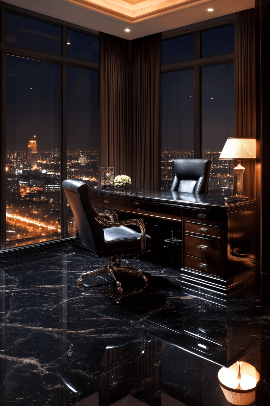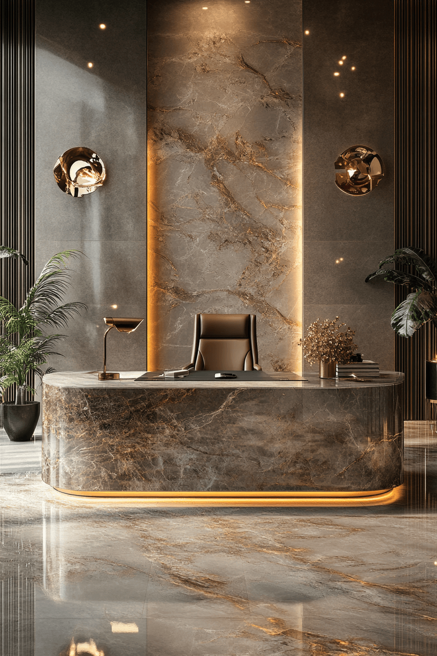 A marble work surface can instantly elevate an elegant home office with its natural veining and luxurious visual texture. The stone becomes a stunning focal point that brings both artistry and refinement into the room. When paired with leather seating and warm metallic details, the space feels sophisticated yet highly usable. Marble also offers a durable surface that feels cool, clean, and timeless. The overall design feels polished, impressive, and deeply elegant. Explore more elegant home office ideas that showcase the beauty of marble!