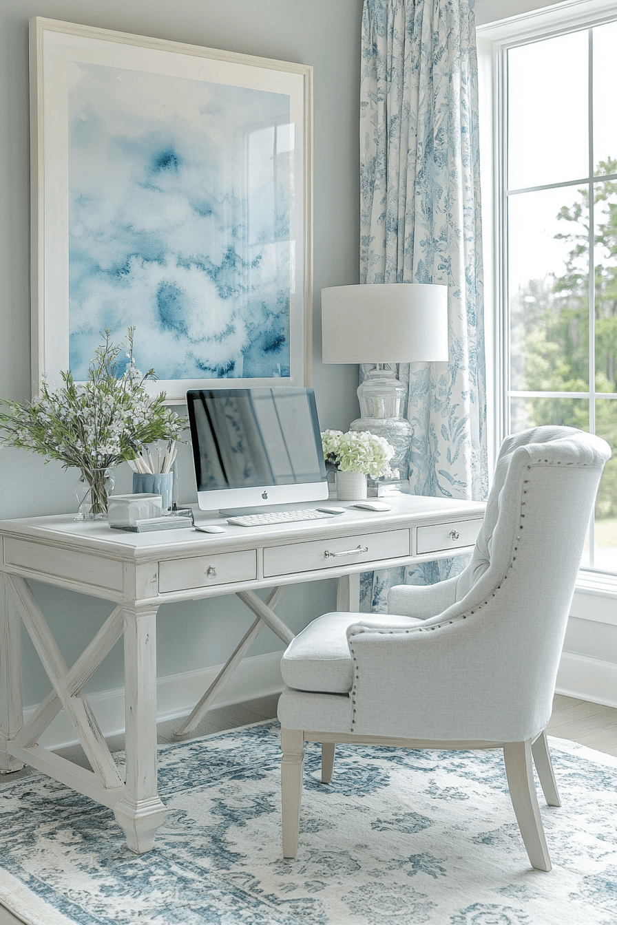 Artistic softness can turn an elegant home office into a peaceful and inspiring place to spend the day. Watercolor-style artwork, muted tones, and airy textiles introduce gentle movement without overwhelming the room. Light-toned furniture keeps the office feeling open and serene. This design approach supports creativity while still maintaining a focused work atmosphere. The result feels graceful, fresh, and beautifully calming. Discover more ways to design an elegant home office with artistic softness and charm!