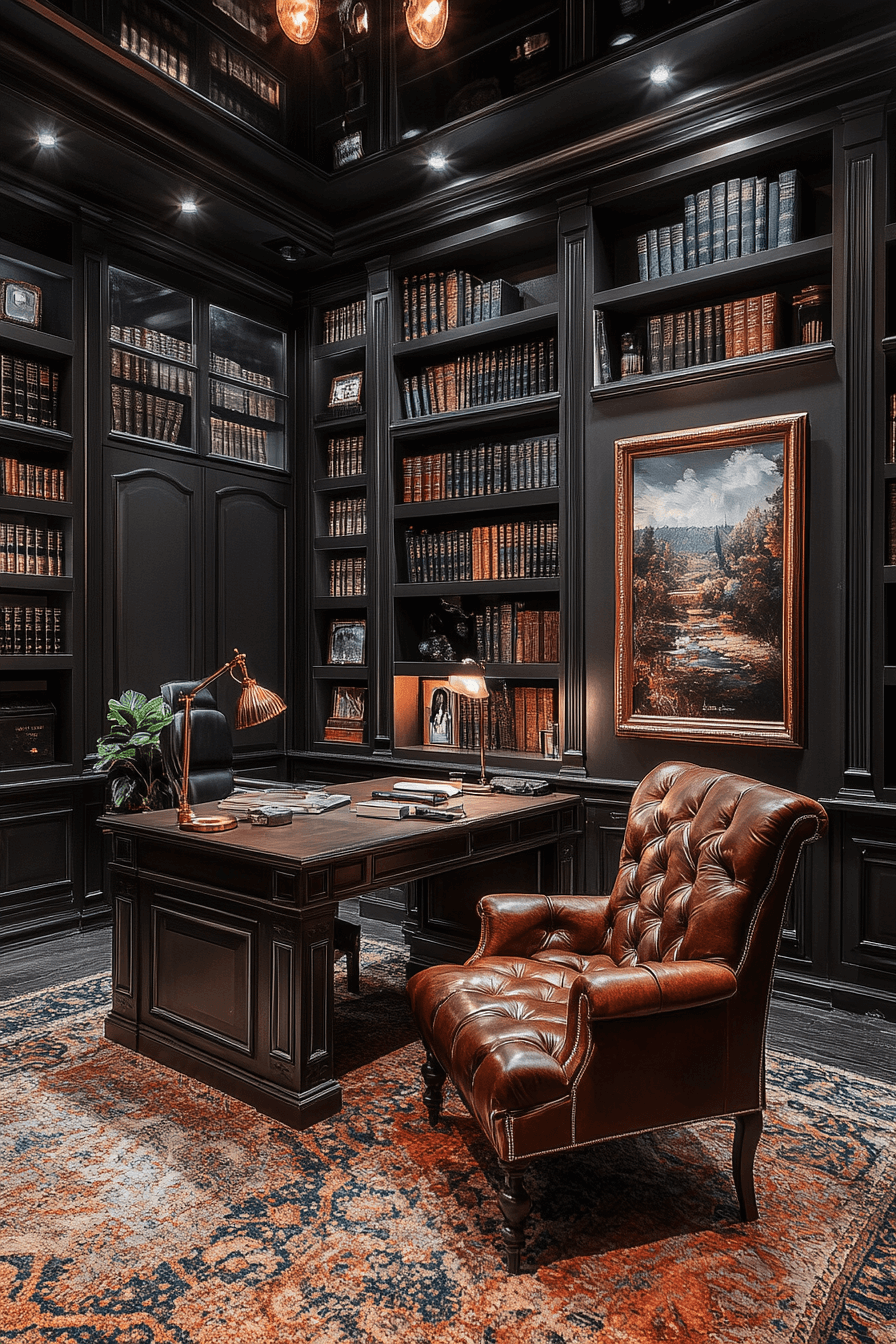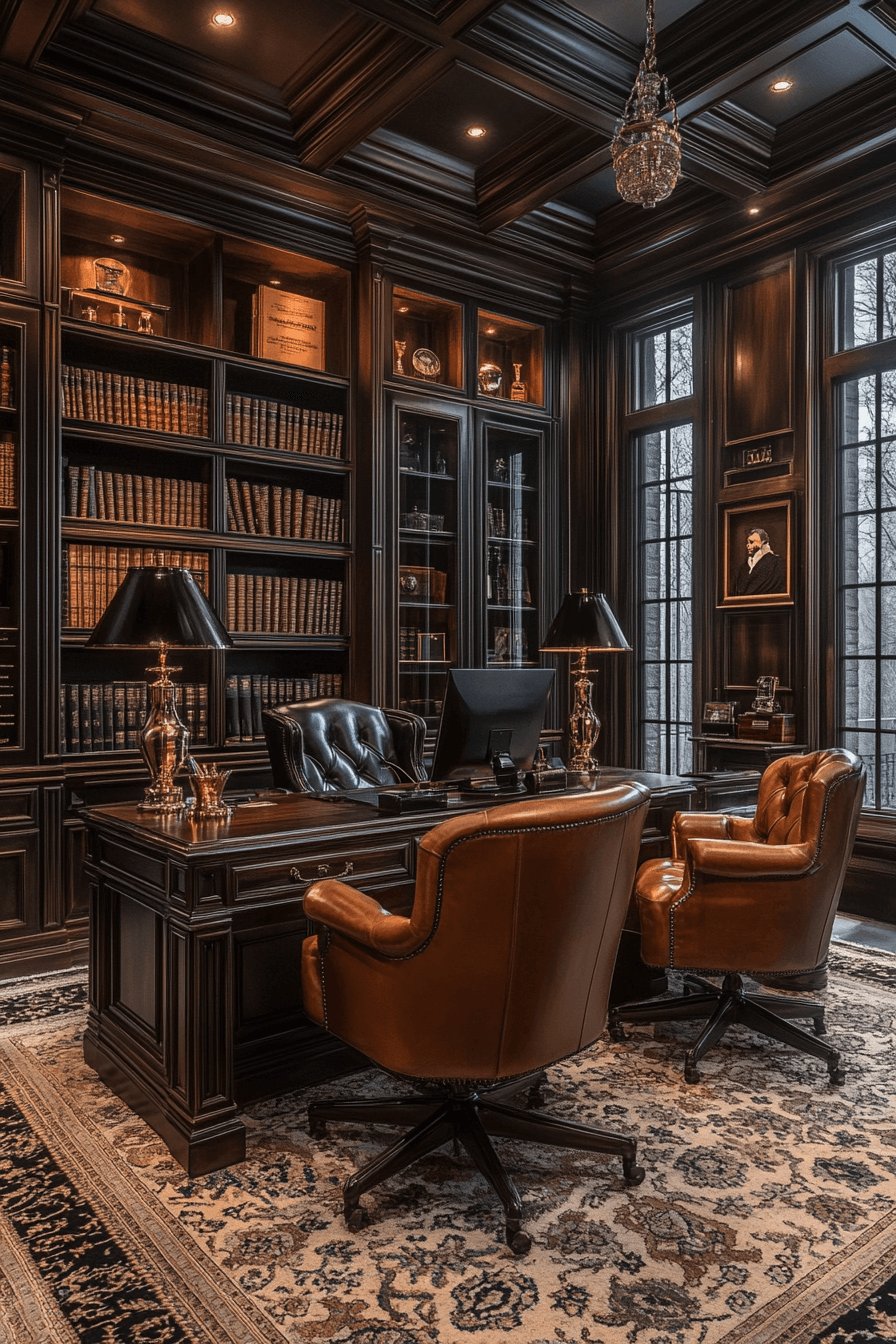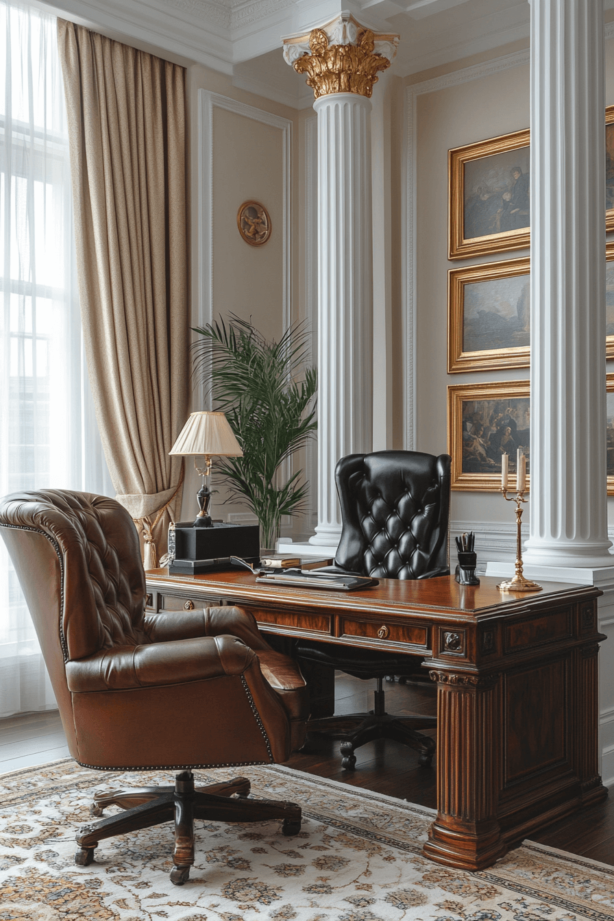 A classic executive look can turn an elegant home office into a space that feels prestigious, warm, and highly functional. A substantial wood desk, leather seating, and tall shelving create a sense of authority while still feeling inviting. Rich textures from rugs, drapery, and statement lighting add depth and personality to the room. The layout works beautifully for focused tasks, meetings, and polished virtual calls. The final atmosphere feels confident, luxurious, and timeless. Step into more inspiration for designing an elegant home office with executive-suite charm!