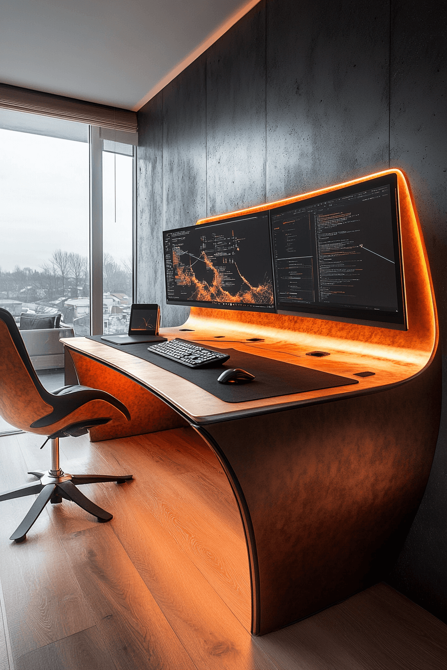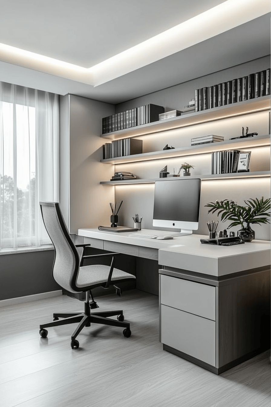 Modern technology can give an elegant home office a sleek and efficient edge while keeping the overall look clean. Wall-mounted screens, hidden cords, and minimalist desks help the room stay visually uncluttered. Smart controls for lighting and temperature add comfort and ease throughout the day. The streamlined design keeps the focus on productivity while still feeling sophisticated. The final setup feels modern, efficient, and beautifully organized. Click to explore more ideas for a high-tech elegant home office with sleek style!