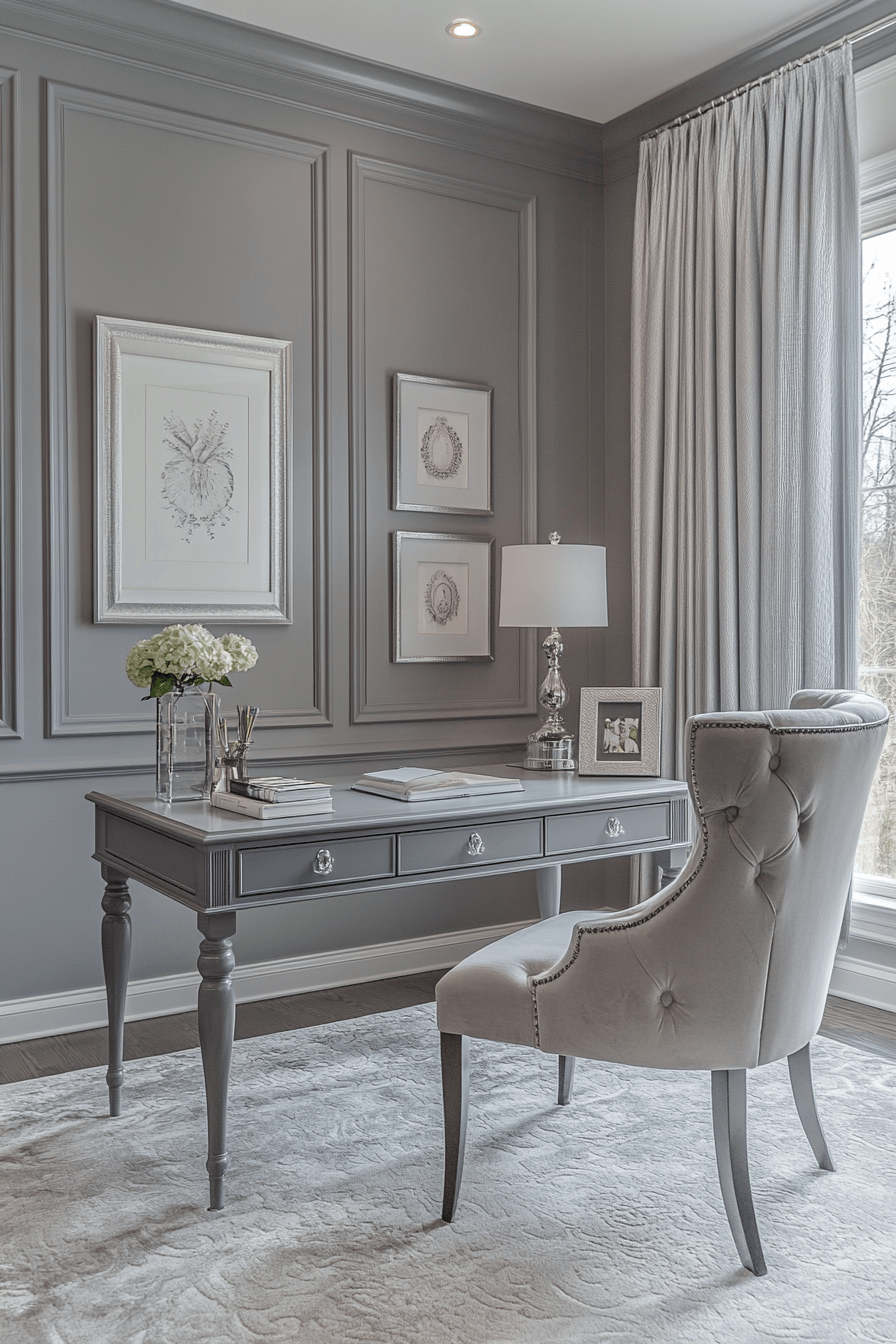 Gray and silver can create an elegant home office that feels soft, sophisticated, and quietly glamorous. A gray base palette helps the room feel calm and composed, while silver accents reflect light and add a polished finish. Mirrors, lamps, and frames in metallic tones keep the space from feeling too muted. Textural layers in textiles and decor bring warmth and depth to the cool palette. The result feels refined, serene, and beautifully luminous. Discover how gray and silver can elevate your elegant home office beautifully!
