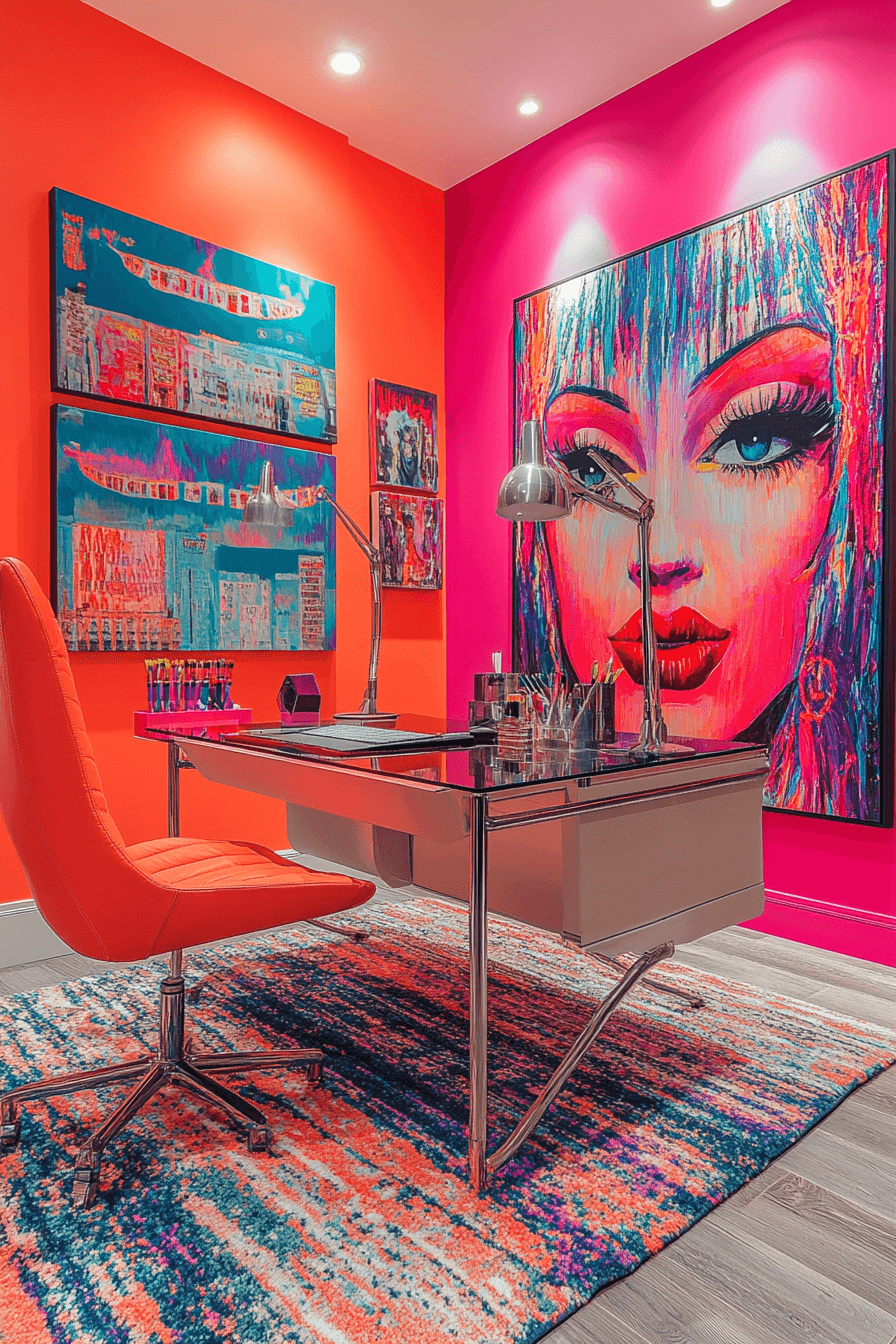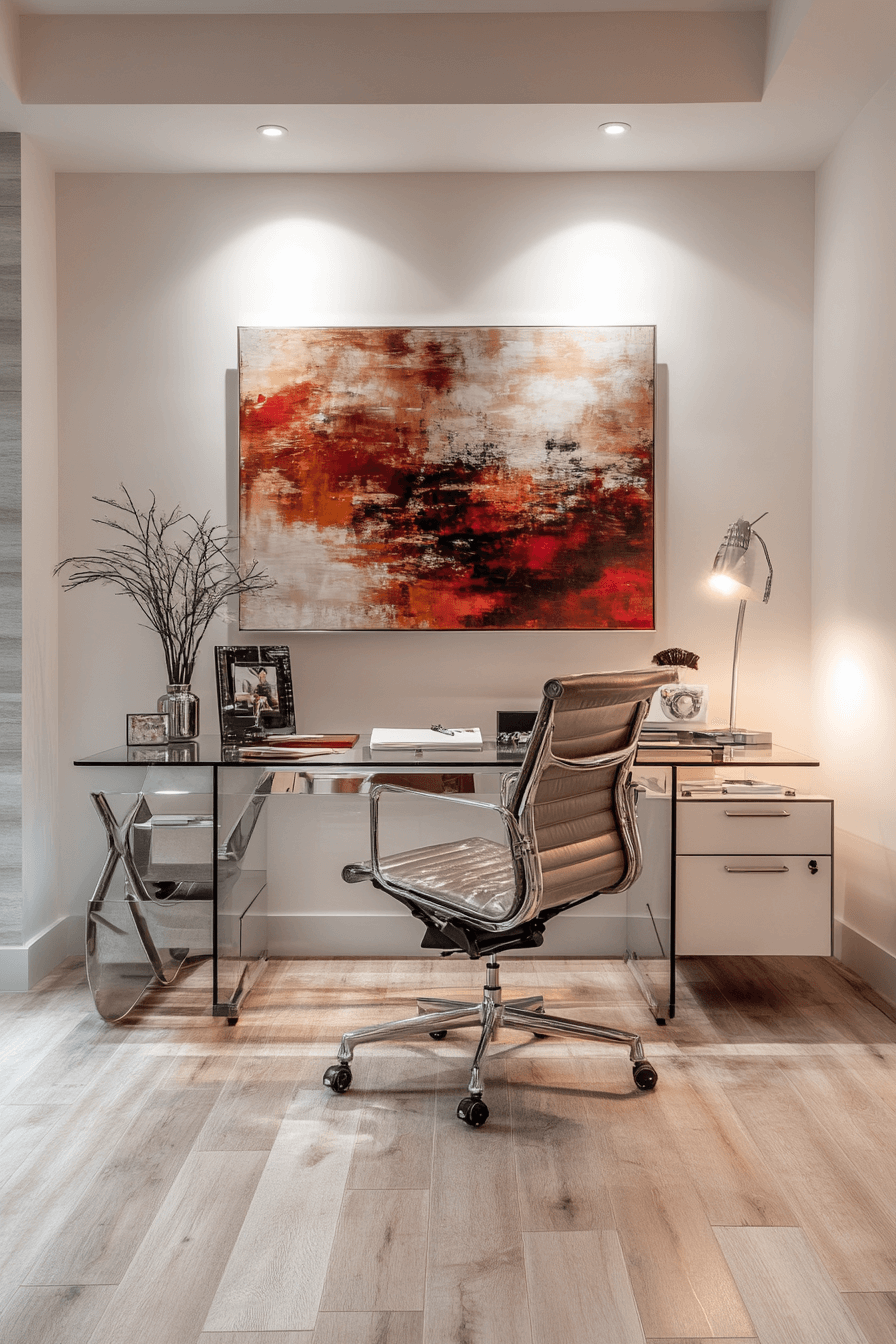Bold artwork can bring life to an elegant home office while still keeping the room polished and work ready. Large abstract pieces, rich color, and clean contemporary furnishings create a setting that feels inspiring and expressive. The key is balancing those energetic details with thoughtful organization and restraint. This allows the office to feel creative without becoming chaotic. The finished design feels motivating, stylish, and full of personality. Explore more ways to design an elegant home office that sparks creativity and focus!