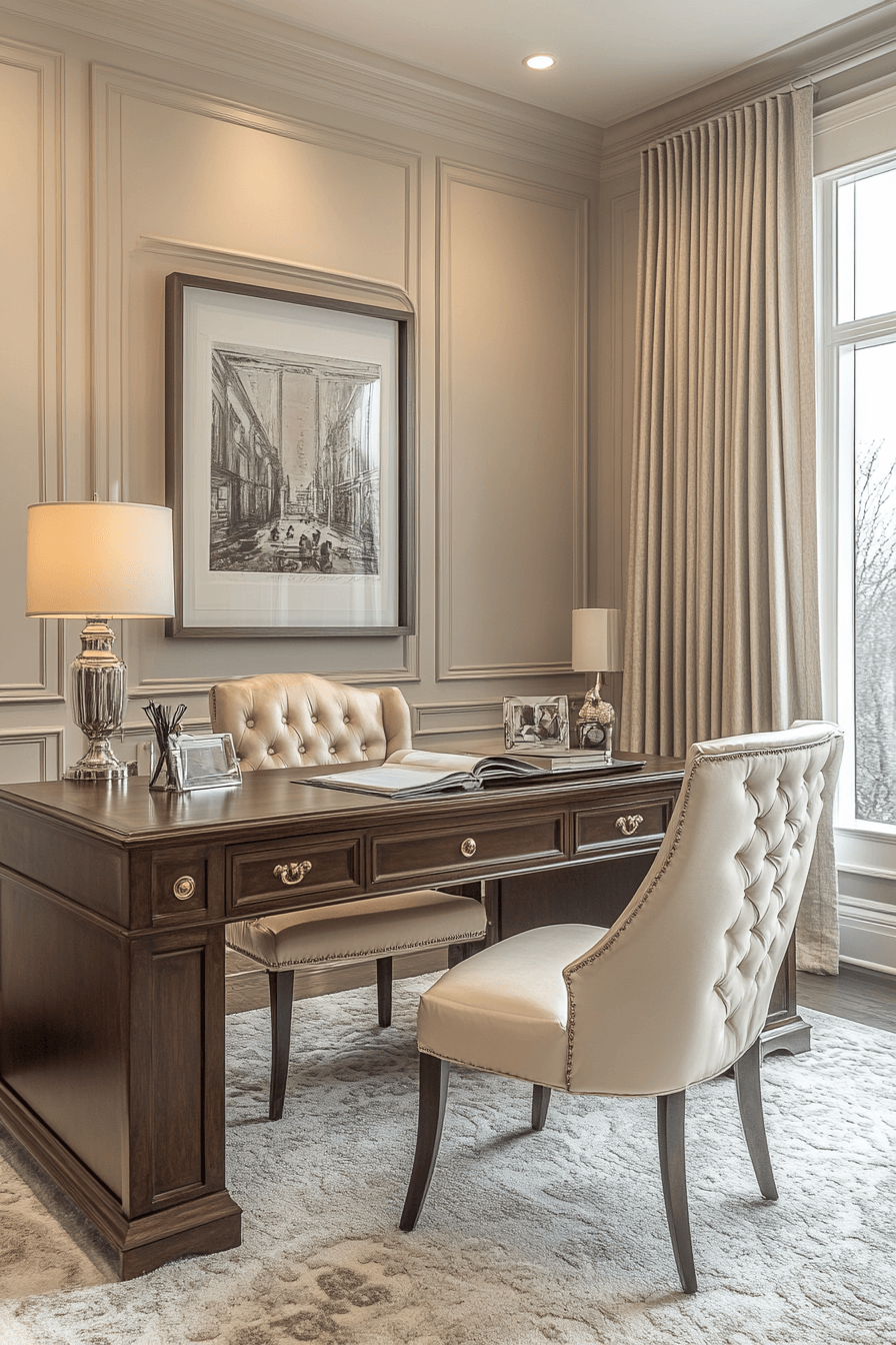 Neoclassical influence can give an elegant home office a timeless sense of grandeur and poise. Decorative moldings, symmetry, and graceful drapery instantly make the room feel more architectural and refined. Upholstered chairs, framed art, and sculptural touches add depth while keeping the overall design polished. Even with its classic inspiration, the room can still feel highly functional for modern work. The final effect feels stately, sophisticated, and enduringly beautiful. Click to uncover more inspiration for a neoclassical elegant home office!