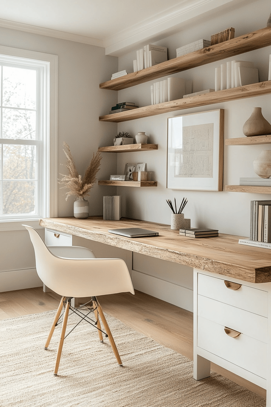 White surfaces paired with warm wood can make an elegant home office feel bright, balanced, and naturally inviting. Crisp walls and simple furniture create a fresh backdrop for focused work, while wood accents bring warmth and texture into the room. This contrast keeps the office from feeling too stark or too rustic. Minimal decor and smart organization help preserve the clean look. The finished workspace feels timeless, calm, and effortlessly refined. Tap to explore more elegant home office ideas that blend white simplicity with natural wood warmth!